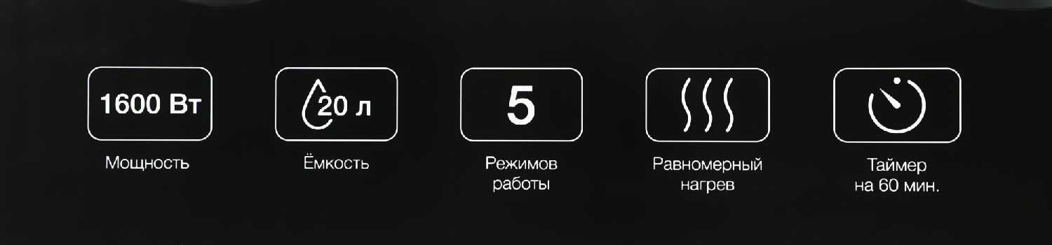 - + 5 режимов, таймер до 60 мин, качество сборки, дверца широко раскрывается и легко, быстро набирает нужную температуру, стоимость не кусается.