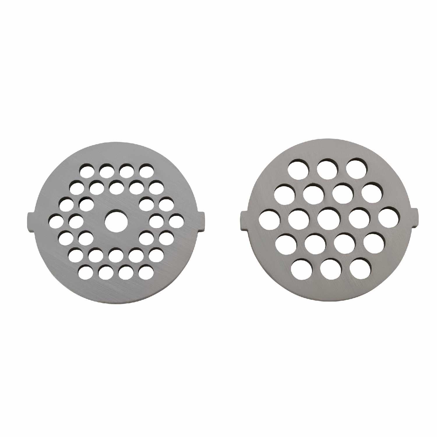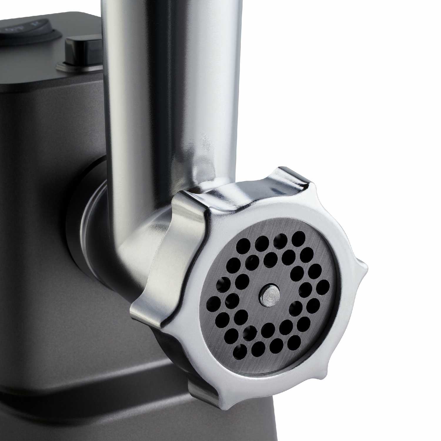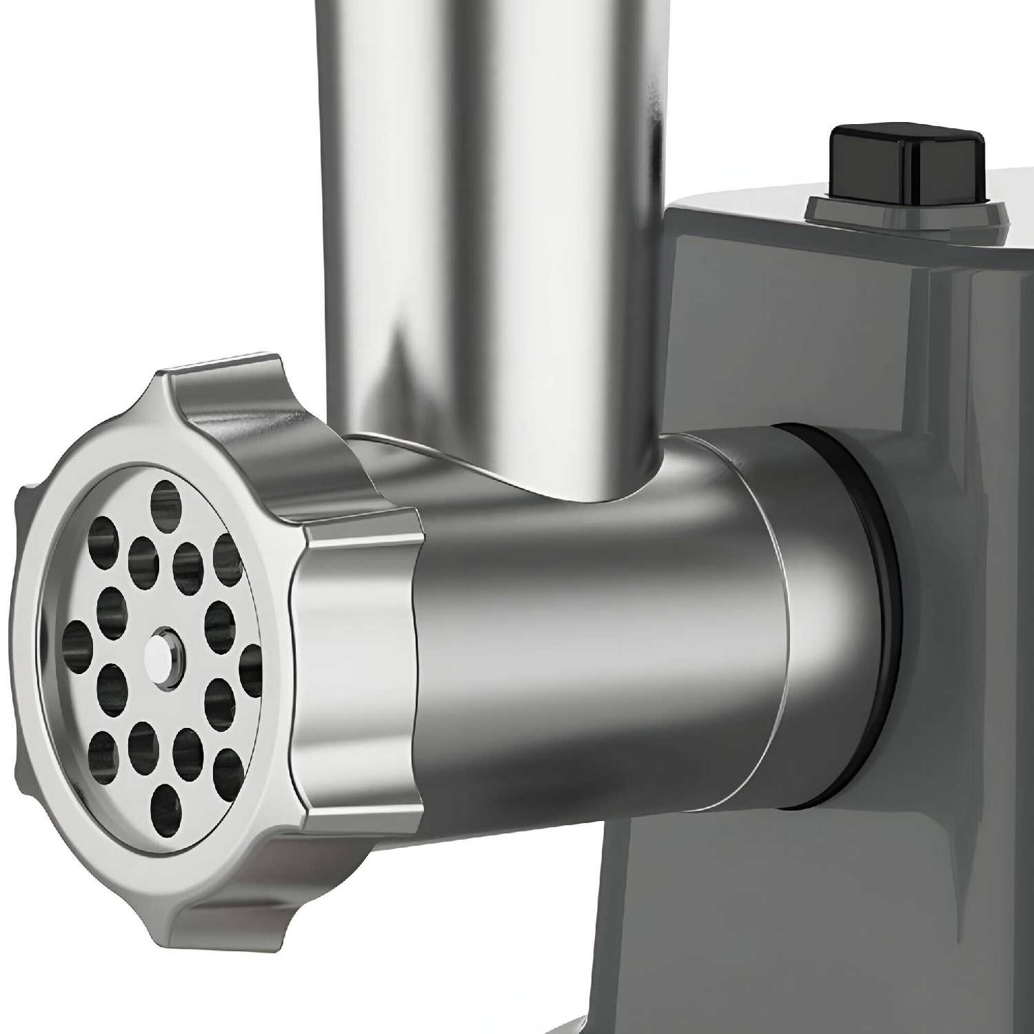 - Острые кованые ножи и перфорированные решётки обеспечивают однородность фарша без комков.