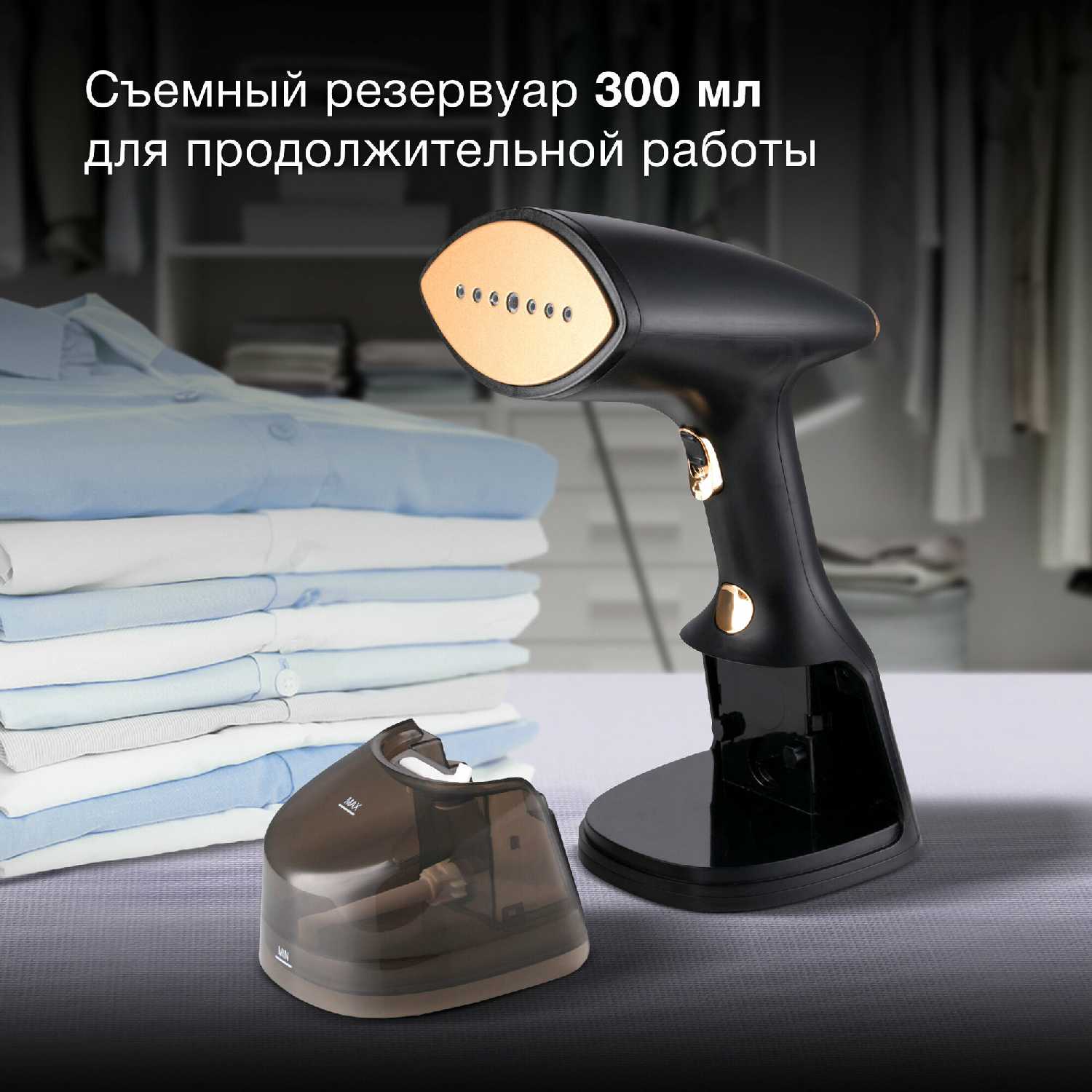Внешне устройство привлекательно: лаконичный черный корпус, современные сенсорные кнопки с подсветкой. Но за этим скрываются проблемы. Пользователи получали изделия с налетом на паровых отверстиях, указывающим на возможное использование до продажи. Пластик корпуса не всегда обеспечивает надежную герметичность — в некоторых случаях отмечалось протекание воды. Резервуар объемом примерно 0.3 литра (не 0.5 л) требует частого долива, его хватает лишь на 8-10 минут работы, что достаточно для 2-3 вещей, но не для масштабных задач.