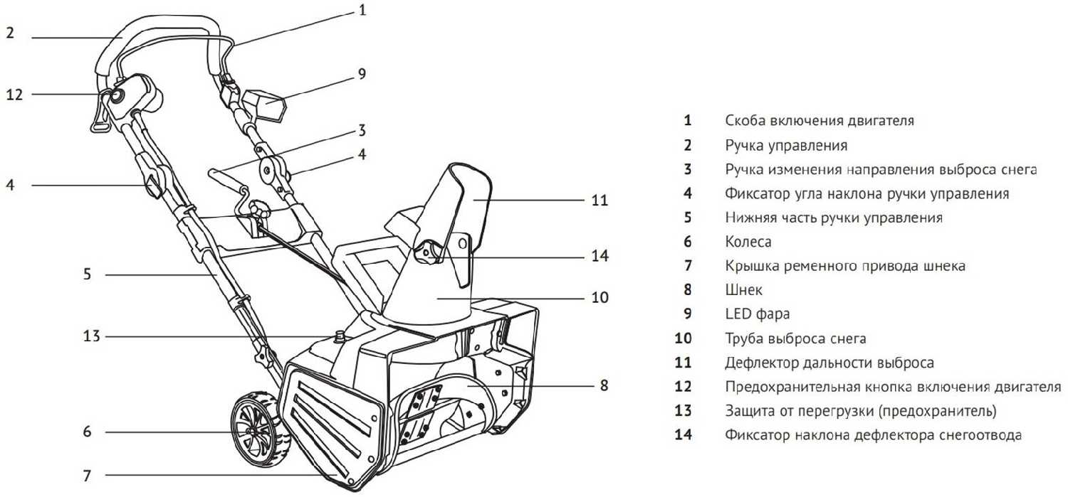 | Дополнительная информация : | рекомендуемая высота уборки снега до 200 мм, скорость вращения шнека 2100 об/мин, модель оснащена защитой от перегрузки (предохранителем) фиксатором наклона дефлектора снегоотвода предохранительной кнопкой включения двигателя фиксатором угла наклона ручки управления, полимерный корпус позволяет работать при температуре до -50°С, увеличенный диаметр колес |