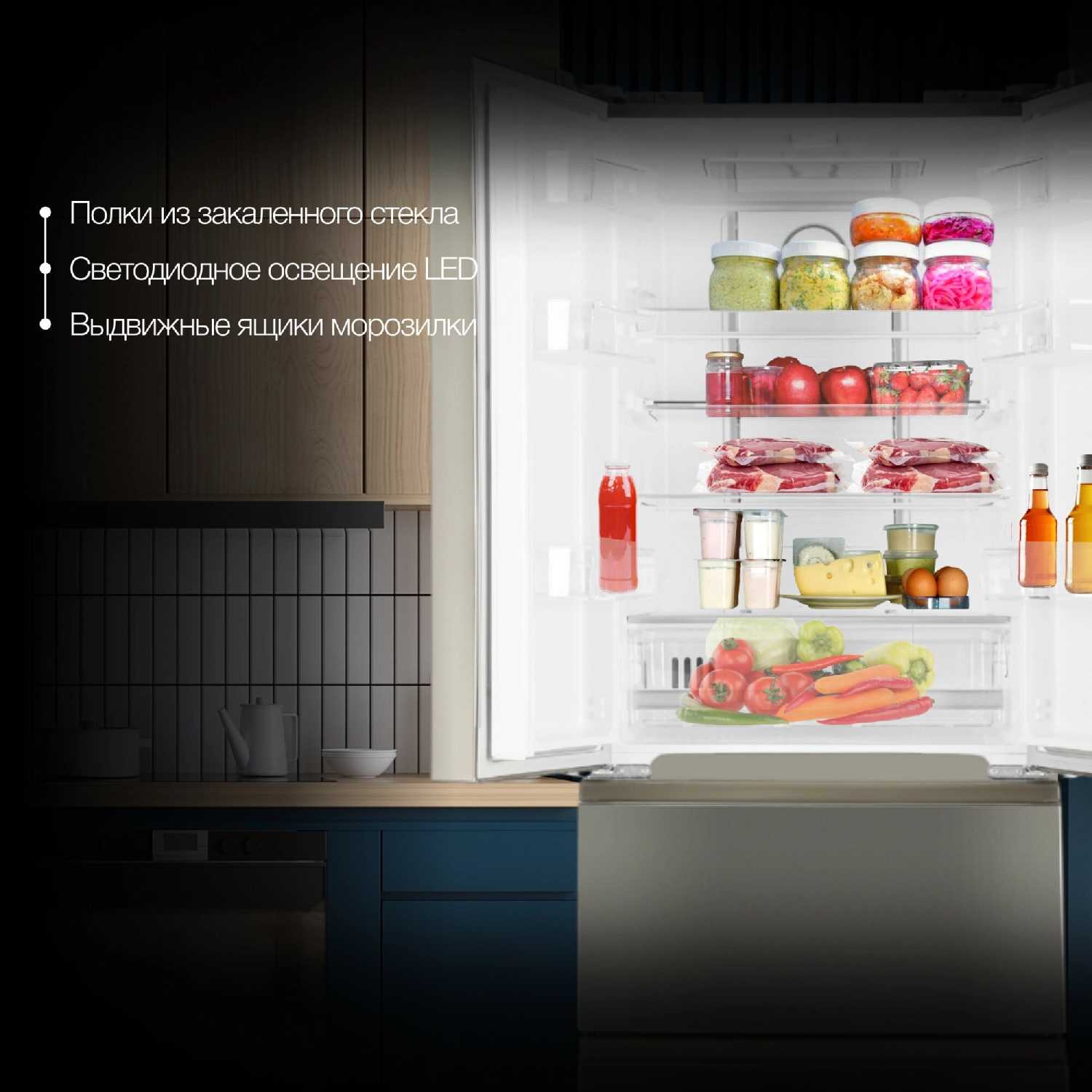 Продукты остаются свежими дольше благодаря равномерному охлаждению и отдельным зонам: овощи не вянут, мясо сохраняет текстуру, молоко не киснет. Пользователи отмечают, что яблоки не желтеют быстро, а зелень держится без проблем. No Frost и регулировка температуры предотвращают порчу. Это особенно заметно по сравнению со старыми моделями. -