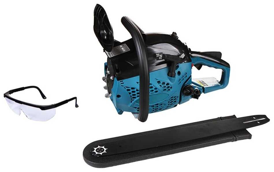 Помимо базовой комплектации, в коробке обнаружены: защитные очки, мерная емкость для топливной смеси с градацией, напильник для заточки цепи, мини-отвертка для регулировки карбюратора. Напильник часто требует доработки — пользователи сразу его точат перед применением. -