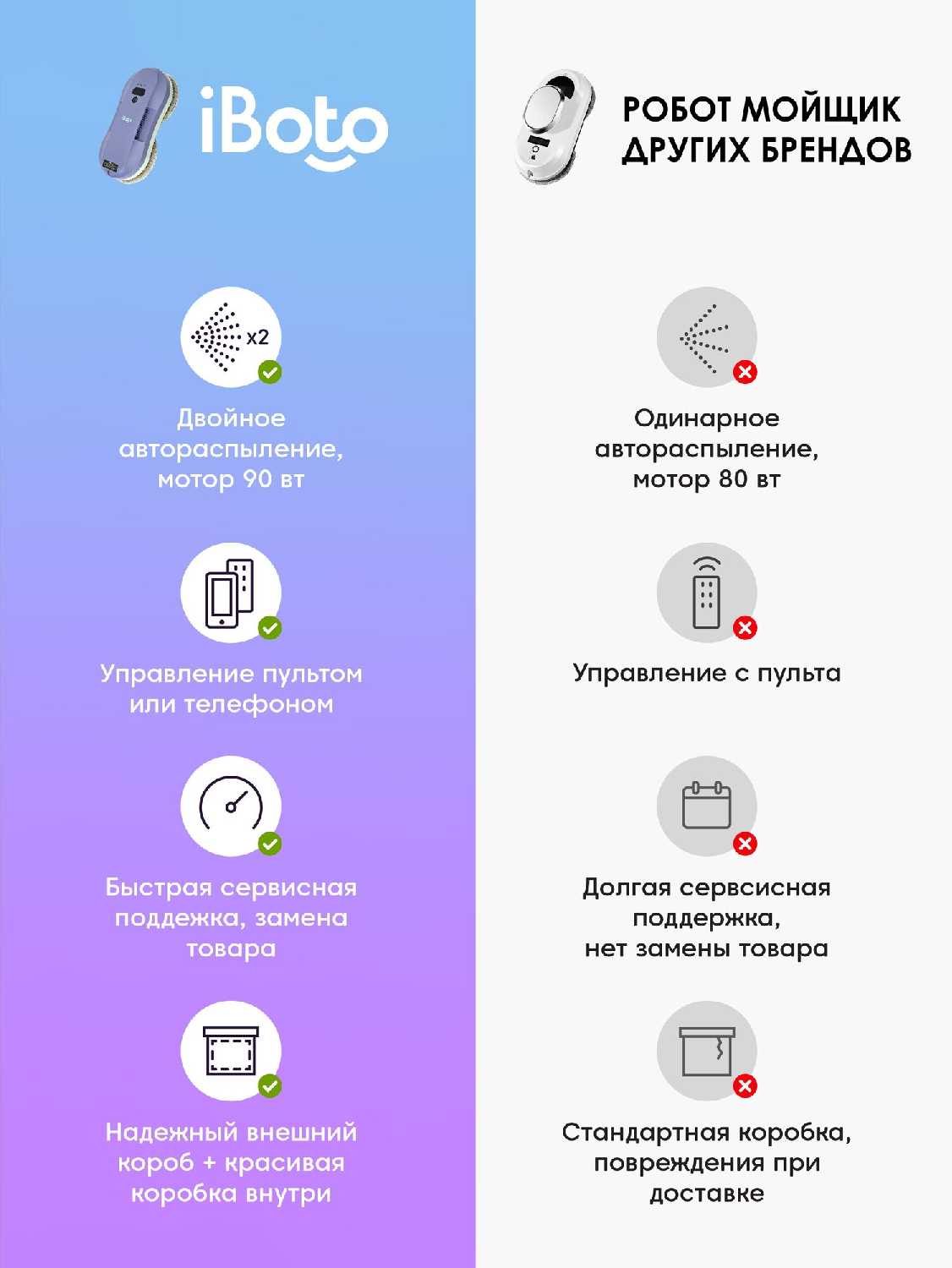 - + Хорошая «игрушка» скажем так, для ленивых))) на первый взгляд, но чистит отлично, очень доволен, теперь жду весны чтоб стекла с наружи почистить. Очень порадовал комплект! Есть даже батарейки в пульт, продавец не забывает о покупателях и положил гарантийный талон с гарантией 1 год, также указан номер сервиса поддержки! В комплекте запасные кольца для салфеток, функция двойного распыления прям порадовала: робот не тратит время на разворот и очень быстро на мой взгляд моет.