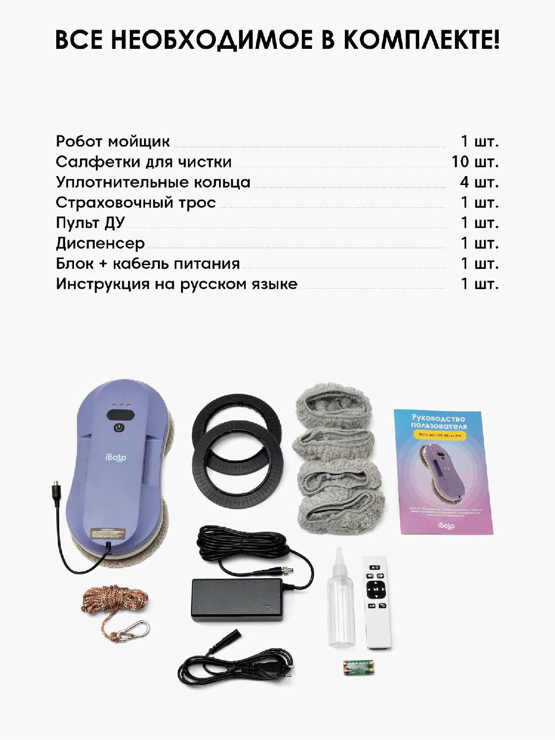 В комплект входит 5 пар многоразовых салфеток из микрофибры, которые можно стирать. Для качественной мойки всего остекления в стандартной трехкомнатной квартиры одного комплекта часто недостаточно, так как салфетки быстро загрязняются и требуют замены или промывки для избежания разводов. Пользователи рекомендуют сразу приобретать дополнительный комплект оригинальных салфеток для комфортного использования. -
