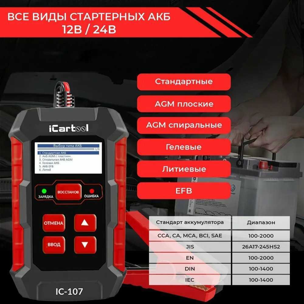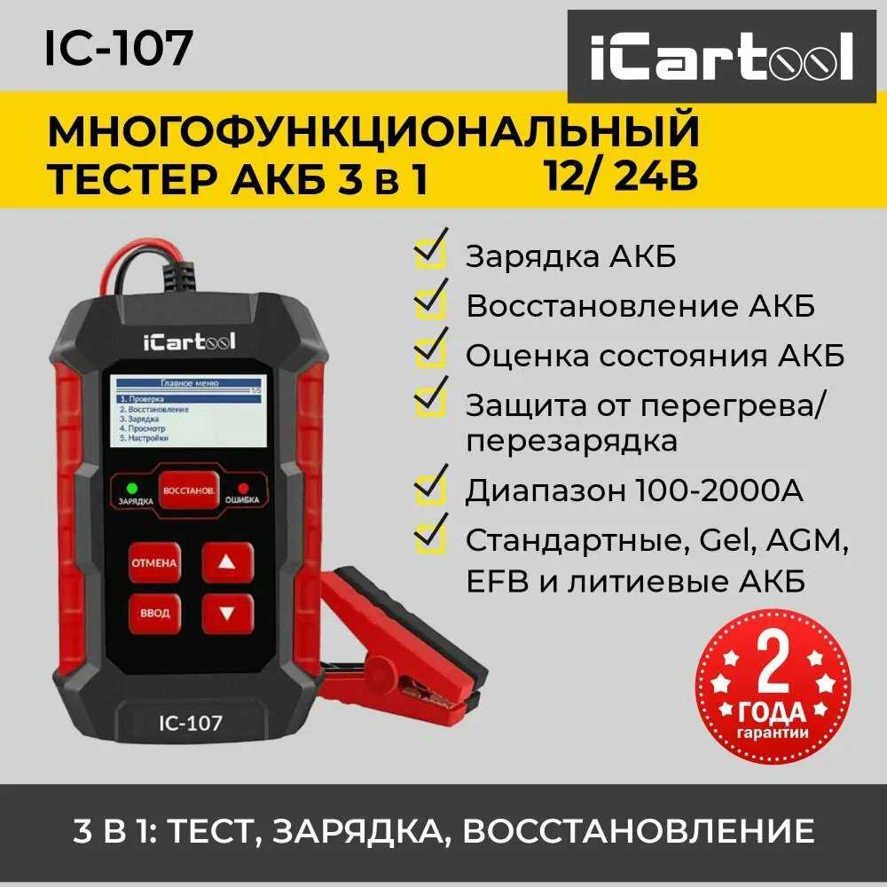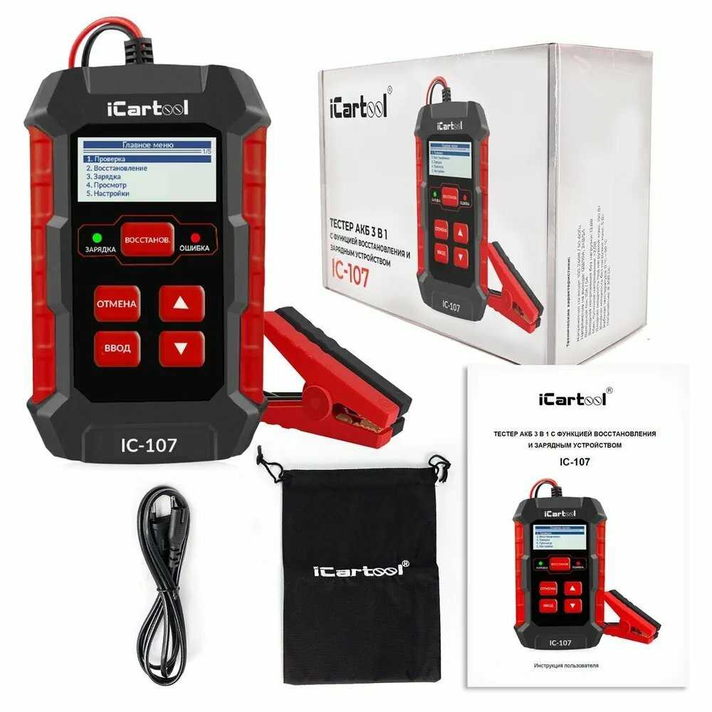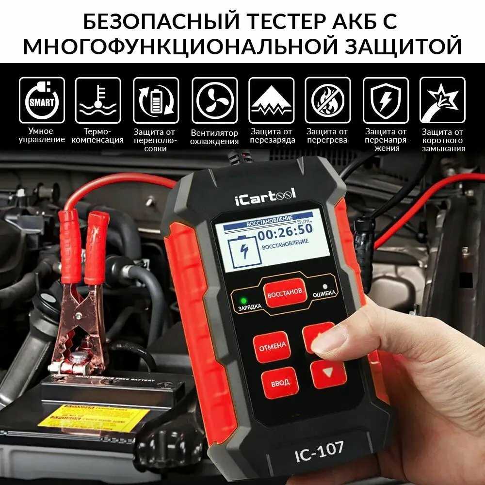 - + Я давно искал такой универсальный прибор, и iCartool IC-107 полностью оправдал мои ожидания, а даже превзошел их. Хочу поделиться основными достоинствами, которые отметил для себя. Во-первых, это его невероятная многофункциональность: в одном компактном корпусе собраны и тестер АКБ, и зарядное устройство, и функция восстановления. Раньше мне приходилось пользоваться тремя разными приборами, теперь же все необходимое под рукой, что невероятно экономит и время, и место в гараже. Во-вторых, мне очень импонирует удобство использования. Большой и четкий дисплей отлично читается даже при ярком свете, а интуитивное меню не требует изучения инструкции — разберется даже новичок. Процесс проверки аккумулятора занимает буквально минуту, и ты сразу видишь вольтаж, состояние пластин и рекомендацию — заряжать, менять или можно восстанавливать. В-третьих, я в полном восторге от функции восстановления (десульфатации). У меня валялся старый, почти «убитый» кислотный аккумулятор, который уже плохо брал заряд. Решил испытать на нем этот режим, и после нескольких циклов он реально ожил! Напряжение пришло в норму, и он снова стал держать заряд. Это просто магия, я считаю, прибор уже окупил себя только за счет этого. И, наконец, как приятный бонус, хочу отметить качественную сборку и полную комплектацию.