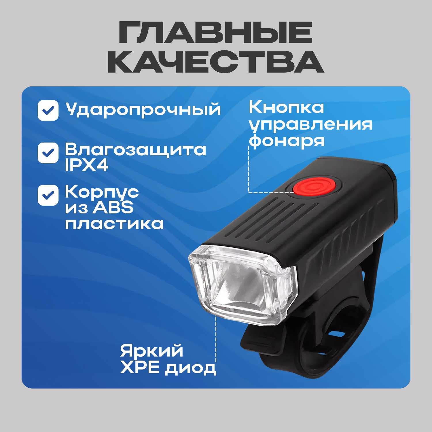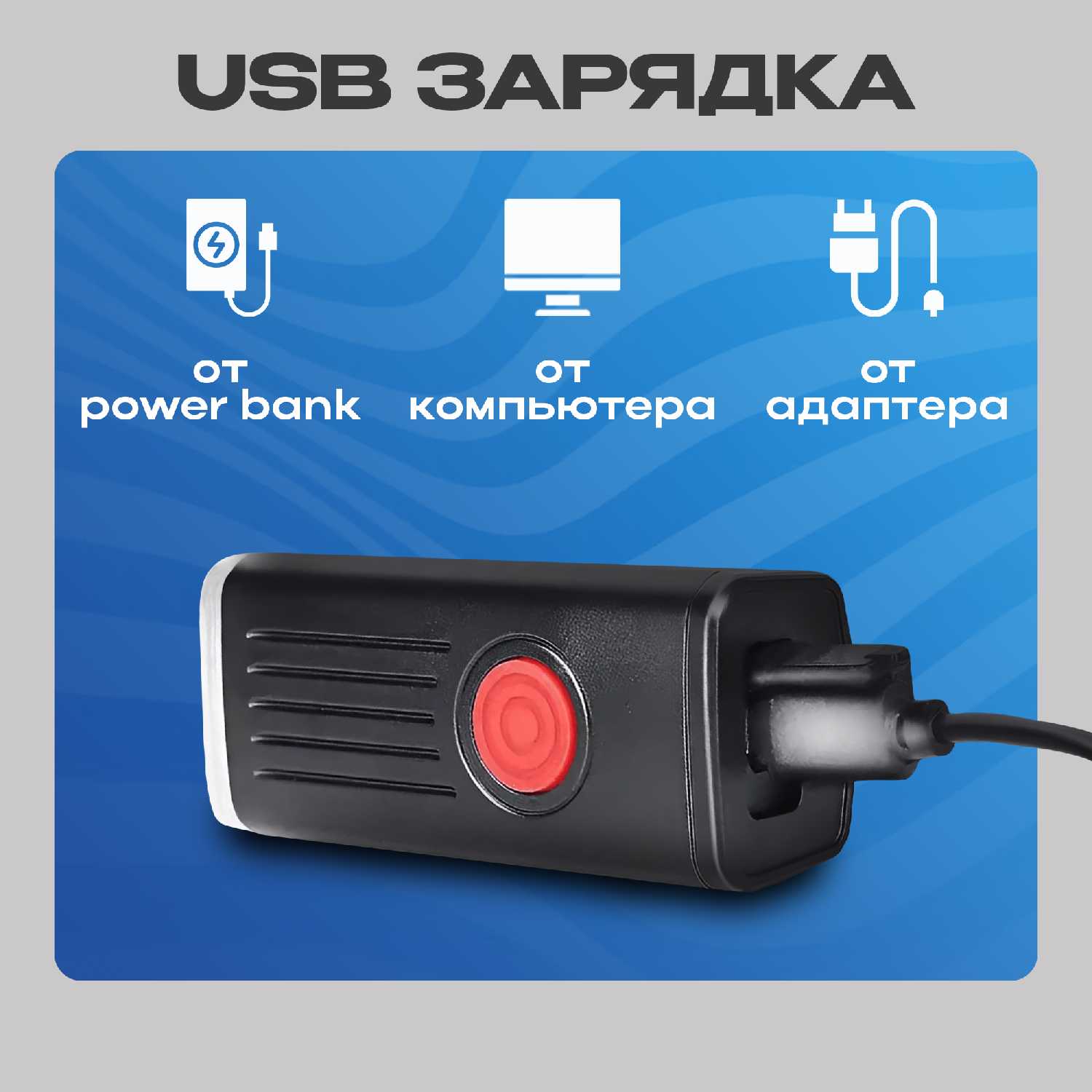Особенности : | USB-зарядка, влагозащищенный, регулировка угла наклона, ударопрочный |