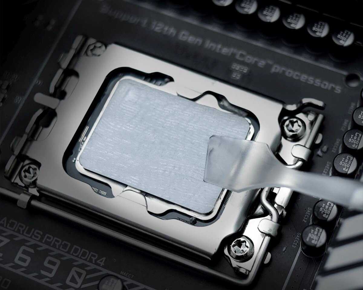 Обязательным условием является тщательная очистка и обезжиривание обеих поверхностей — процессора и основания кулера. Из-за низкой адгезии к металлу малейшие следы предыдущей термопасты или загрязнений препятствуют равномерному распределению. Рекомендуется использовать специализированные очистители или изопропиловый спирт высокой концентрации. После очистки поверхности должны быть полностью сухими — влага значительно ухудшает растекаемость и может создать термический барьер. Некоторые пользователи дополнительно полируют поверхности для улучшения контакта. -