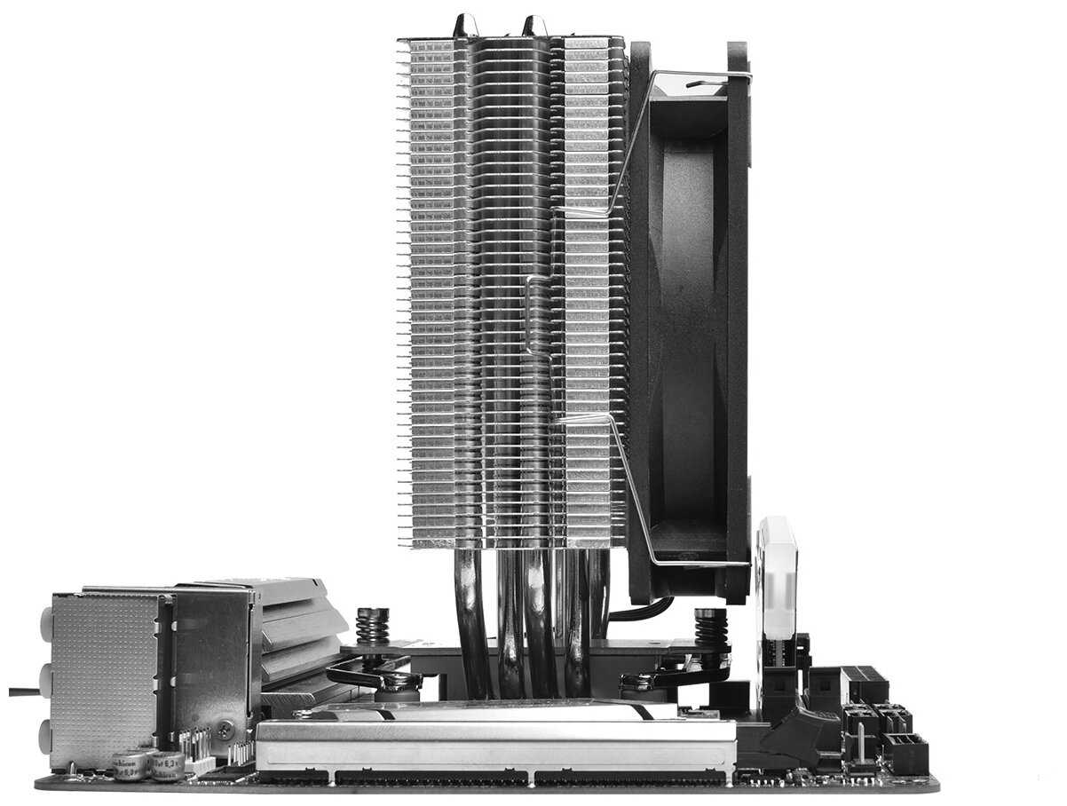 - + Небольшой, аккуратный, в рамках заявленного тепловыделения справляется. В комплекте есть крепление под второй куллер. Если добавить второй, можно добавить еще процентов 20 к тепловыделению, как у чуть более дорогой модели с двумя куллерами.