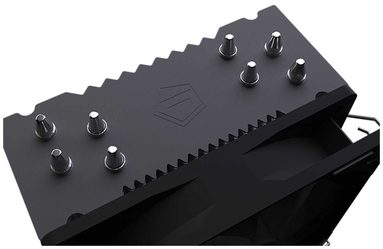 Верхняя пластина радиатора покрашена в чёрный цвет, а в самом её центре красуется логотип ID-Cooling. На основании приклеена бумажная наклейка, защищающая его от случайных царапин, а медные трубки — от окисления.