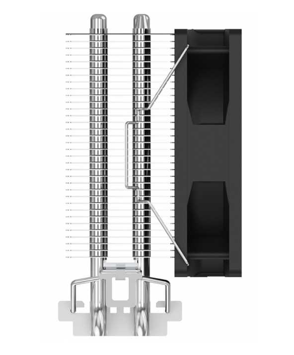 - Снижает температуру процессоров Ryzen 5 5600G, i5-11400F до 60–70°C под нагрузкой благодаря двум алюминиевым теплотрубкам с медным основанием.
