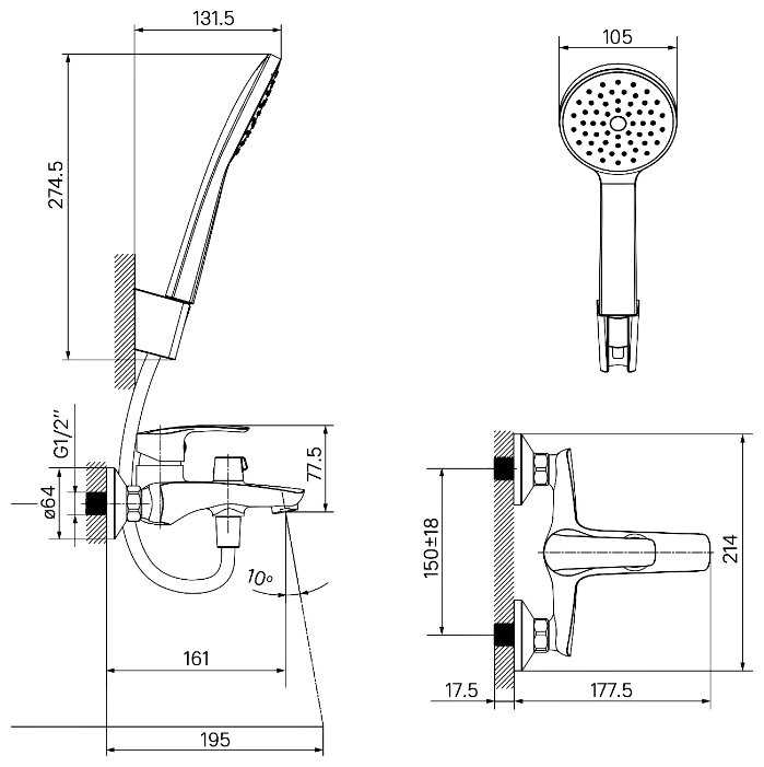 | @Комплектация : | душевая лейка, душевой шланг, настенный держатель, эксцентрики |
