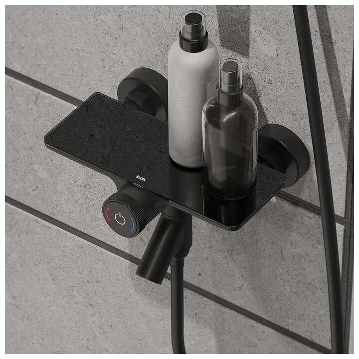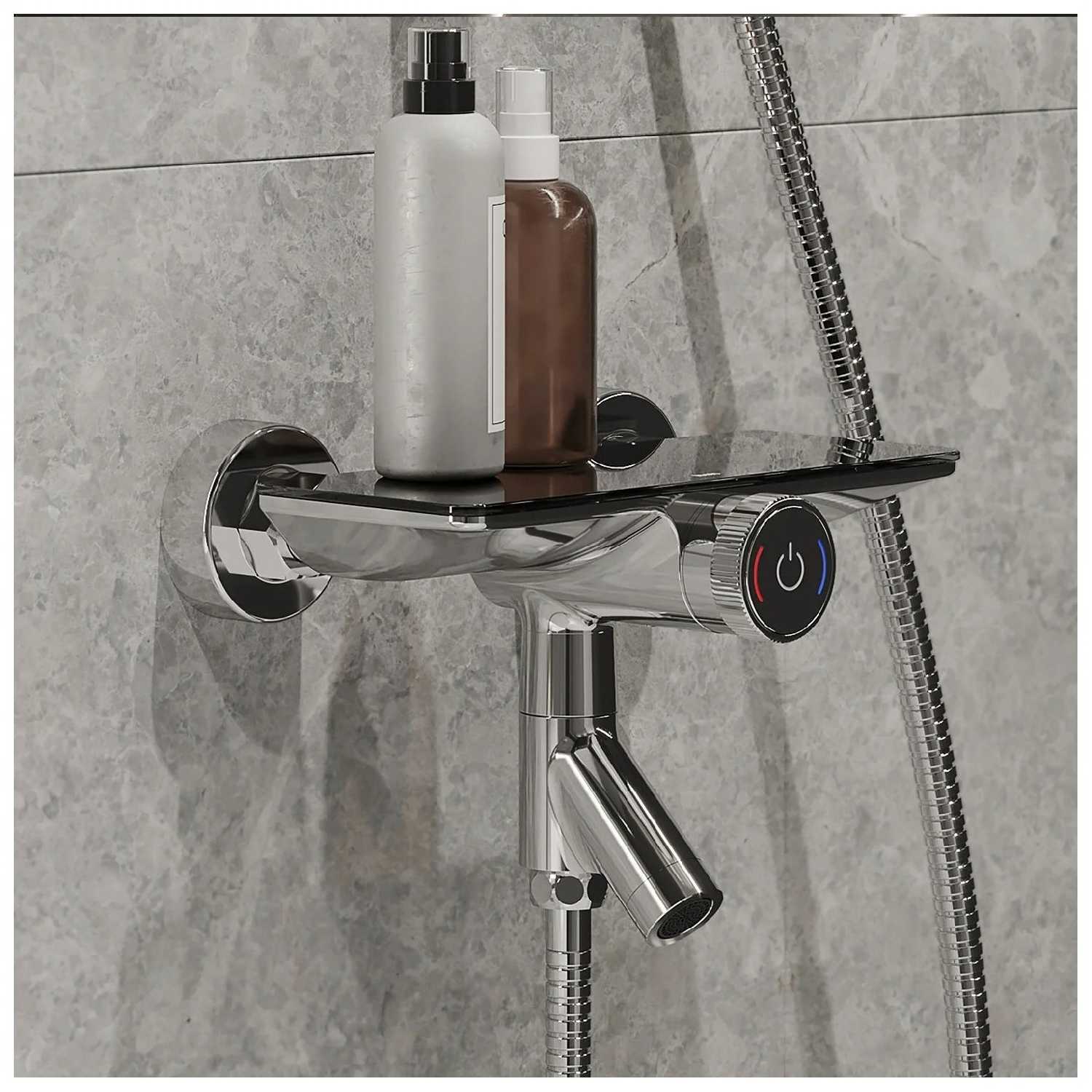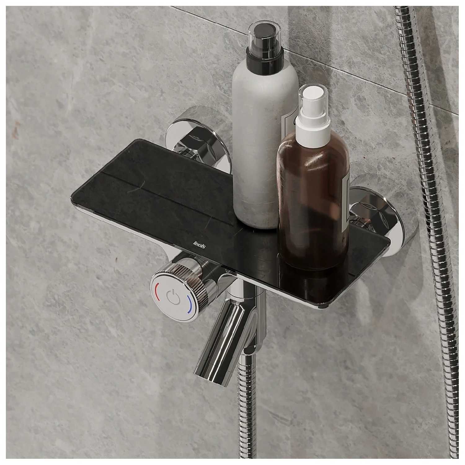 - Встроенная стеклянная или глянцевая полка позволяет размещать шампунь, мыло или гель под рукой, избавляя от необходимости тянуться к нижним полкам.
