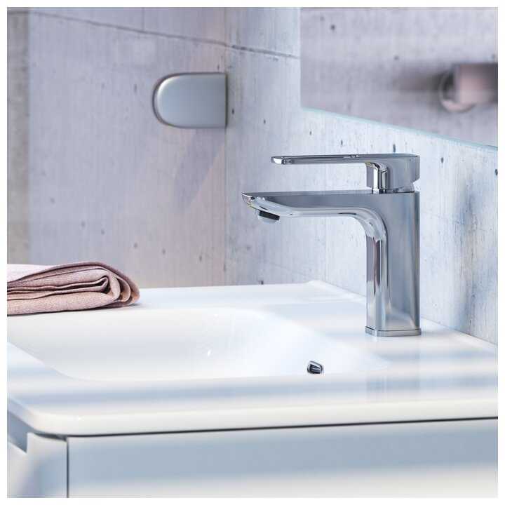 - Дизайн универсален — смеситель сочетается как с прямоугольными, так и с округлыми раковинами.