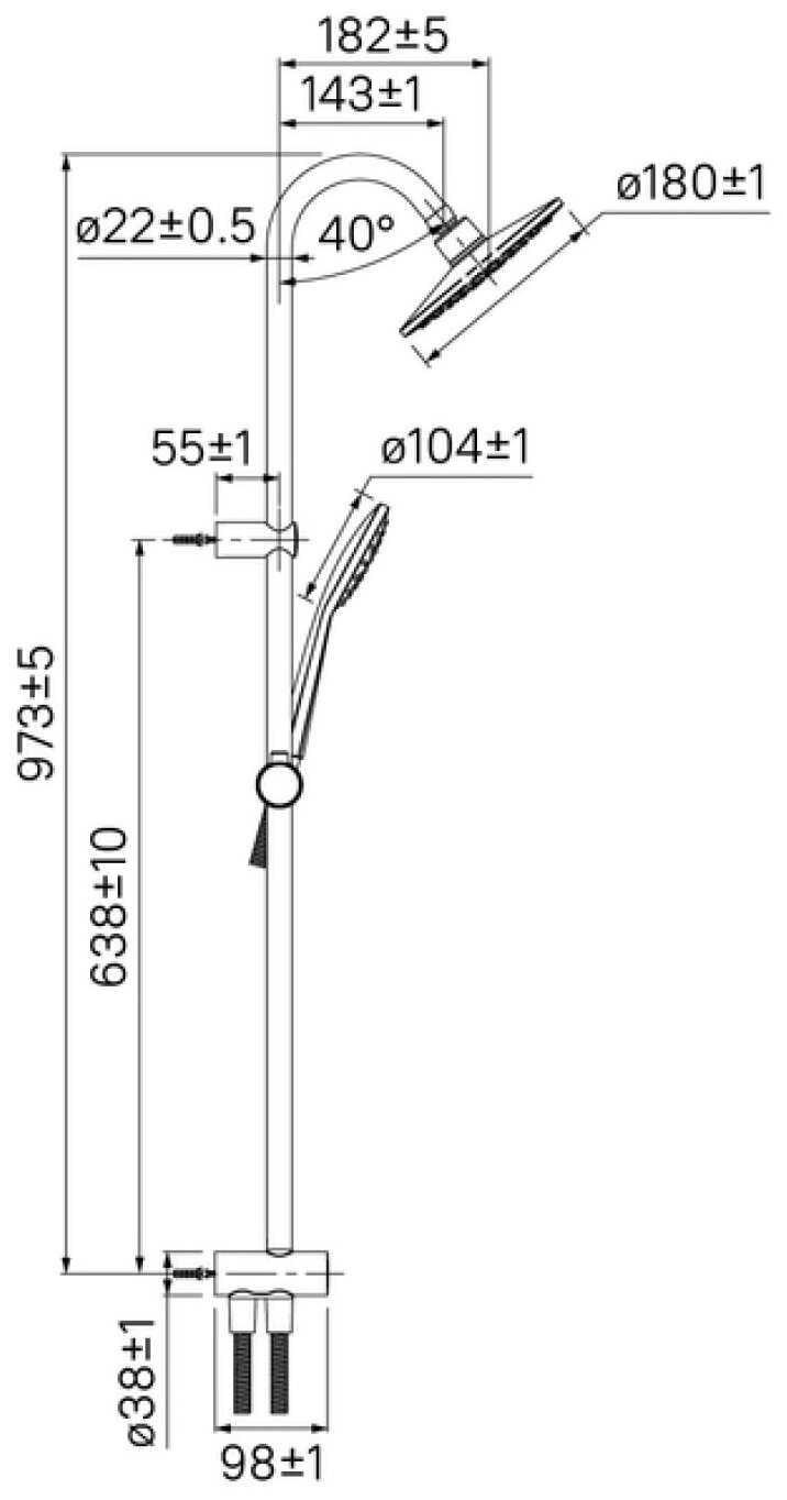 | Дополнительная информация : | высота стойки для душа: 954 мм, диаметр душевой лейки: 105 мм, диаметр верхнего душа: 180 мм |