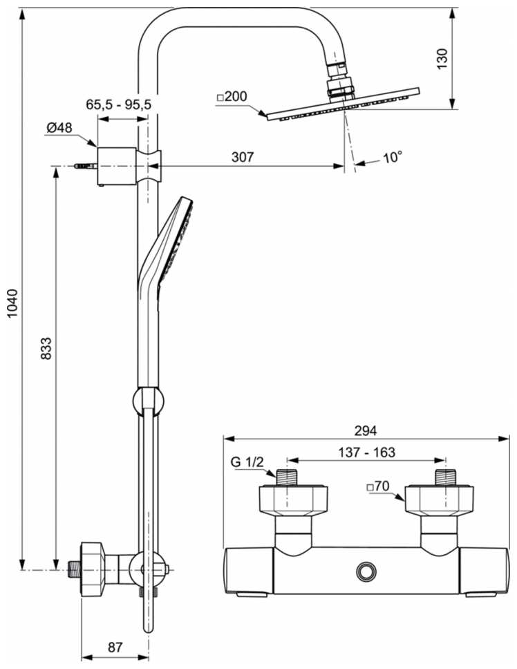 высота стойки для душа: 1040 мм, диаметр душевой лейки: 110 мм, длина верхнего душа: 200 мм, ширина верхнего душа: 200 мм
