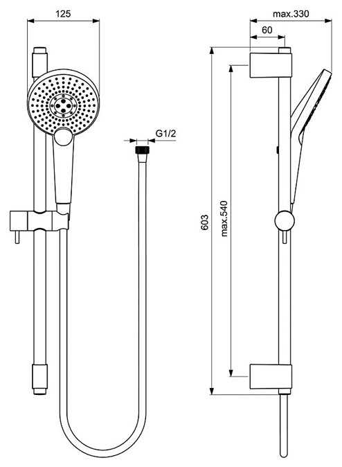 | Комплектация : | держатель лейки, душевая стойка, душевая штанга, лейка, шланг |