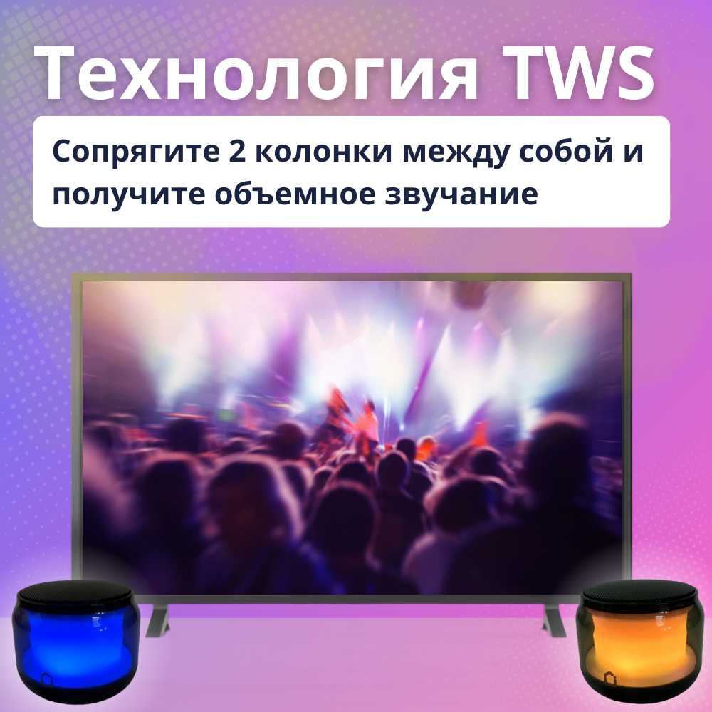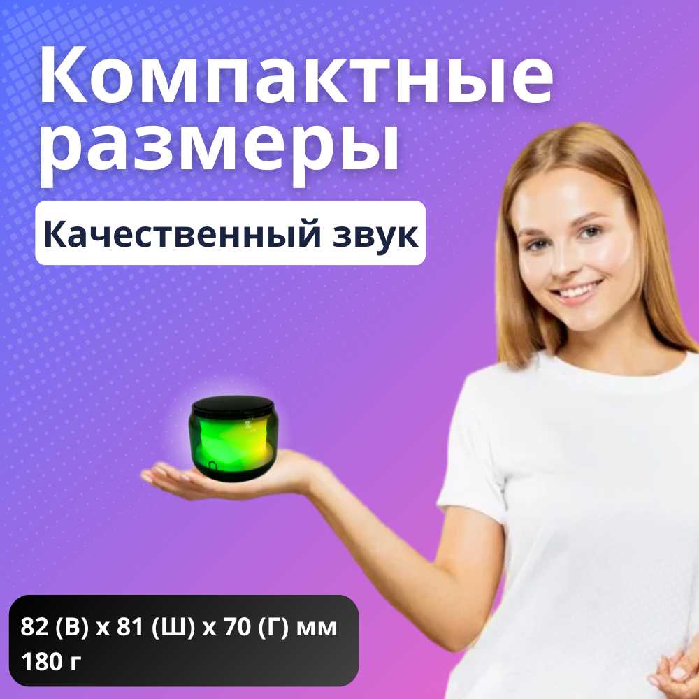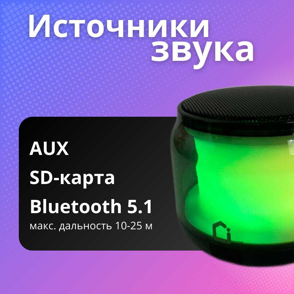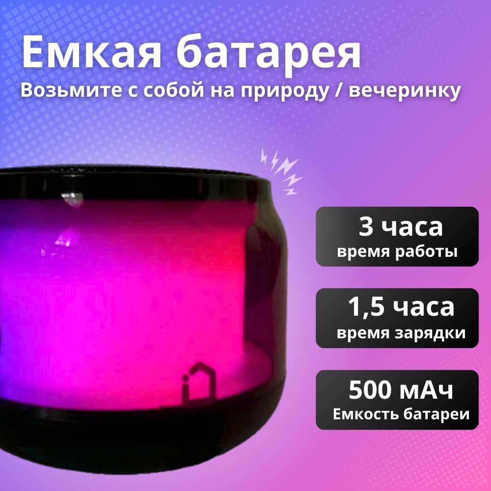- + Красивая и яркая подсветка, нормальная громкость для такого размера и стоимости, работа от аккумулятора
