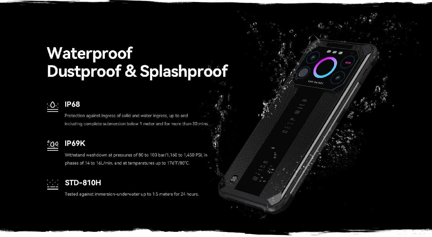 Устройство позиционируется как ударопрочное (IP68/IP69K), что подтверждается тестами пользователей: оно выдерживает падения на бетон, погружение в солёную воду и эксплуатацию при -20°C. Резиновые амортизаторы по углам корпуса и металлическая рамка эффективно гасят удары, хотя задняя крышка склонна к прогибанию. Динамик самостоятельно восстанавливается после контакта с водой за 1-2 часа. Ключевое преимущество перед конкурентами (AGM, Blackview) – вес 250-270 г и толщина 12-14 мм, что на 30% легче типичных защищённых моделей. Однако отсутствие заглушек на разъёме USB-C (только резиновые уплотнители) снижает доверие к влагозащите.