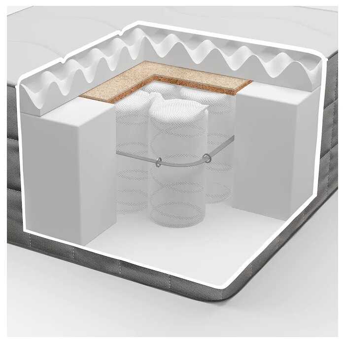 - + Покупали в Икее. Матрас довольно жесткий. Мужу нормально, мне жестко слишком. Поэтому покупали еще тонкий, пришивали сверху. Прослужил 5 лет, пружины под пятой точкой у мужа разбили чехлы и слои сверху, и упали набок, получилась конкретная вмятина. Разобрали (чехол съемный), чтобы починить, поставить пружины на место,...