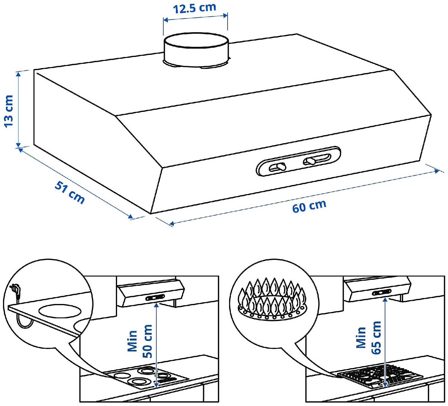 Монтаж и совместимость с кухонной мебелью. Вытяжка разработана для идеальной интеграции с кухонными системами IKEA, в частности, с шкафами серии Метод. В комплекте поставляется бумажный шаблон для точной разметки отверстий в дне шкафа, что значительно упрощает процесс установки и оценивается пользователями как очень удобное решение. Вытяжка может крепиться как на стену, так и к навесному шкафу. Однако для мебели других производителей требуется дополнительный расчет и подгонка размеров, так как инструкция по установке подробно описывает монтаж именно в модули IKEA. Некоторые пользователи, устанавливавшие вытяжку вместо других моделей, сталкивались с необходимостью самостоятельного изготовления креплений. Отмечается, что перед заказом кухни крайне важно сверить размеры вытяжки с габаритами шкафов.