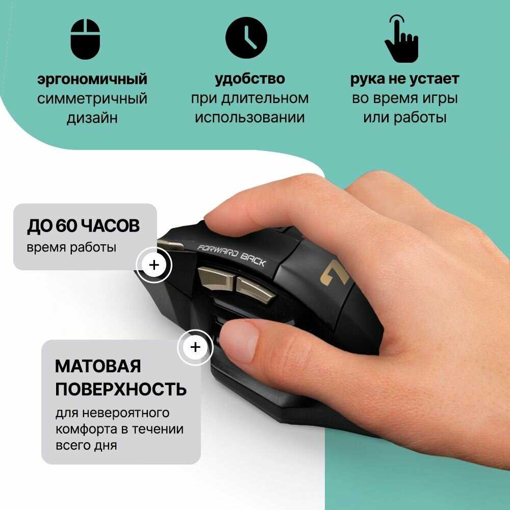- + Подходит для любительского гейминга и комфортна в руке при широкой ладони. Долго держит заряд и поддерживает несколько каналов подключения. Тихие клики обеих основных кнопок, много дополнительных кнопок на корпусе, приятный вес и хорошая эргономика для запястья.