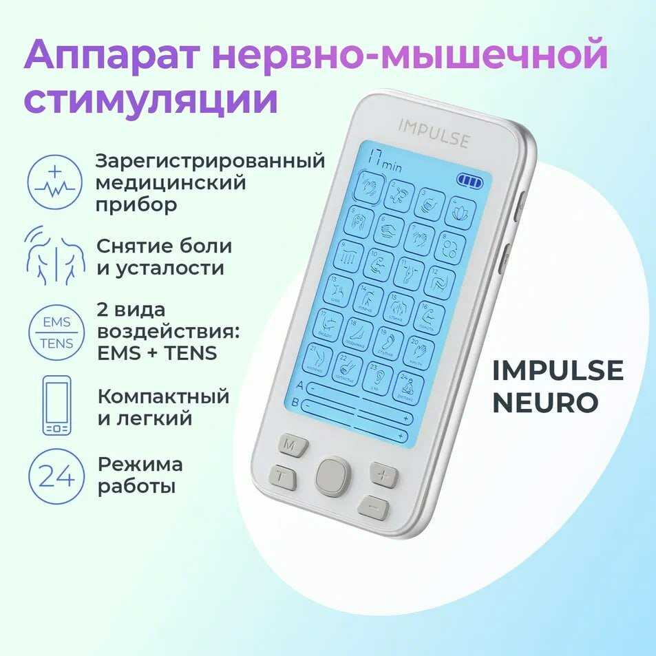 | Подробная комплектация : | Аппарат Impulse Neuro -1 шт • Электроды тип 1 (силиконовая основа) – 4 шт • Электроды тип 2 (хлопковая основа) – 4 шт. • Шнур-кабель для подключения электродов – 4 шт. • Провод USB – 1шт. • Адаптер – 1 шт. • Чехол для хранения и транспортировки – 1шт. • Руководство по эксплуатации – 1 шт. |