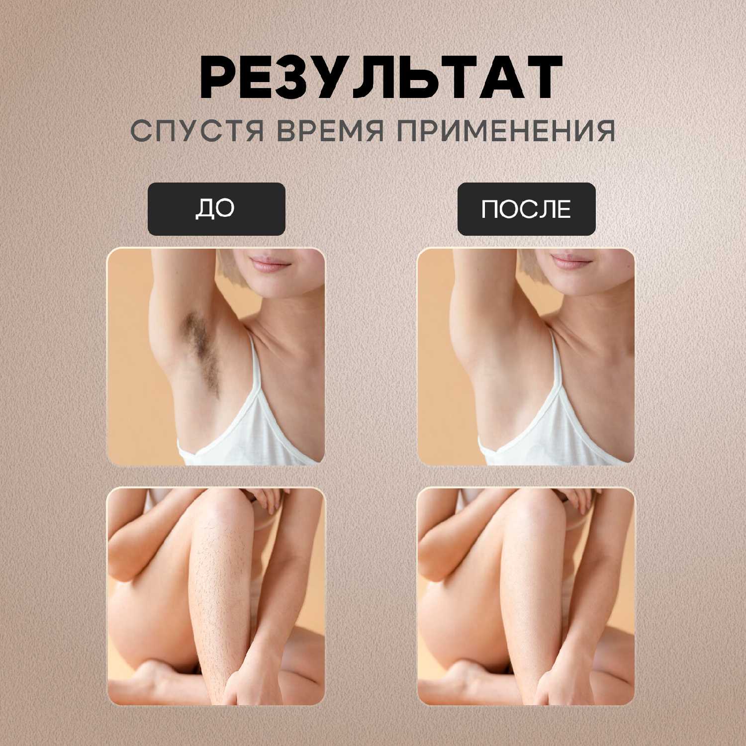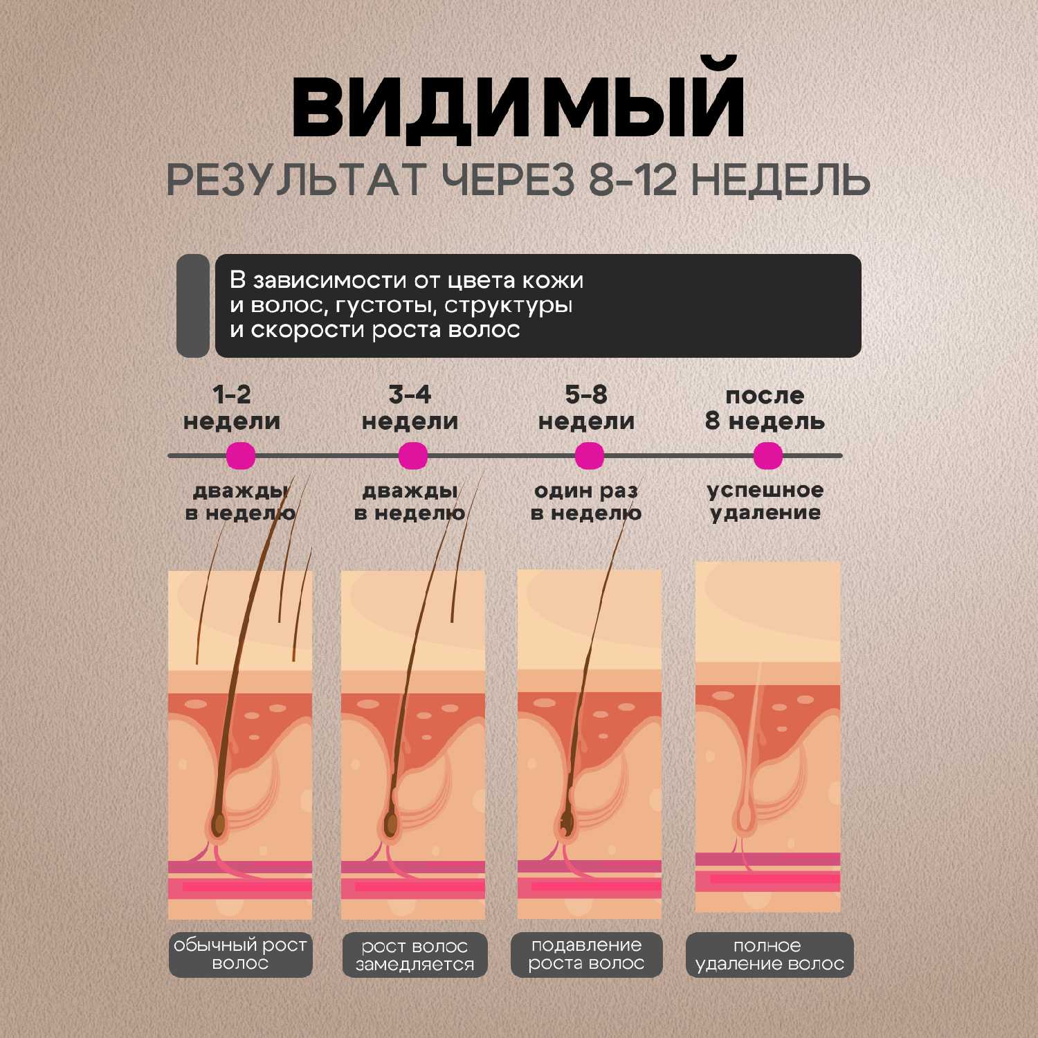 Эффект замедления роста волос заметен после 2-3 месяцев регулярных процедур (2 раза в неделю). Пользователи отмечают, что волосы становятся тоньше, светлее и реже растут, особенно на ногах. Для зон бикини и подмышек прогресс может быть медленнее – первые изменения появляются через 4-6 процедур, но для устойчивого результата требуется систематичность. -