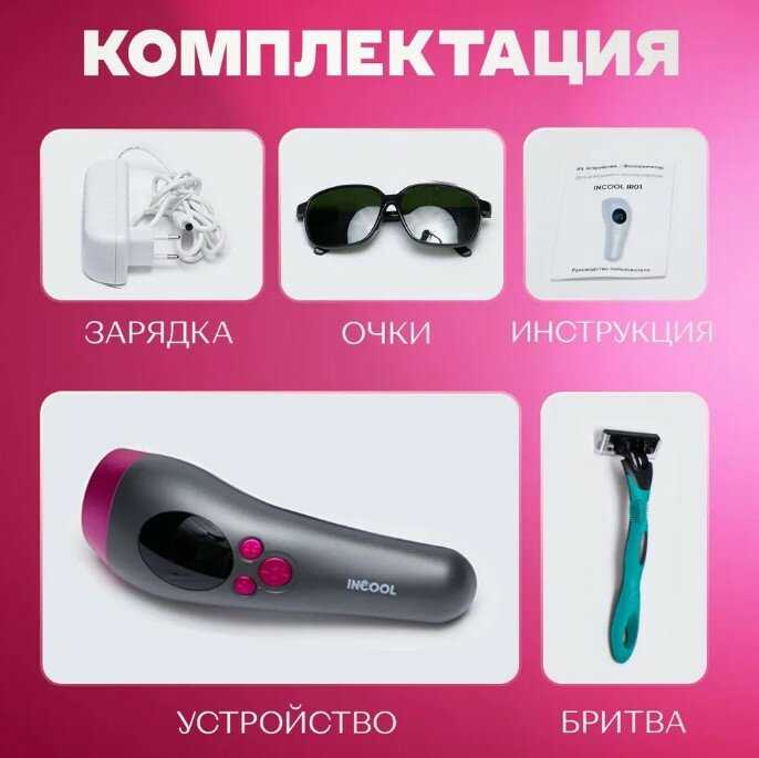 В набор входят защитные очки, бритвенный станок и подробная инструкция, что высоко оценивается пользователями. Очки, несмотря на хрупкость дужек, эффективно защищают глаза от ярких вспышек — их использование обязательно. Бритва упрощает подготовку кожи: волосы необходимо сбривать за день до процедуры, чтобы избежать «подпаливания». Однако некоторые отмечают, что инструкция недостаточно подробна: нет информации о периодичности сеансов (рекомендуется 1 раз в 2 недели) и ограничениях для татуированных участков. Также отсутствуют предупреждения о возможной реакции чувствительной кожи на охлаждающий элемент — у одной из пользователей он вызвал лёгкое обморожение.