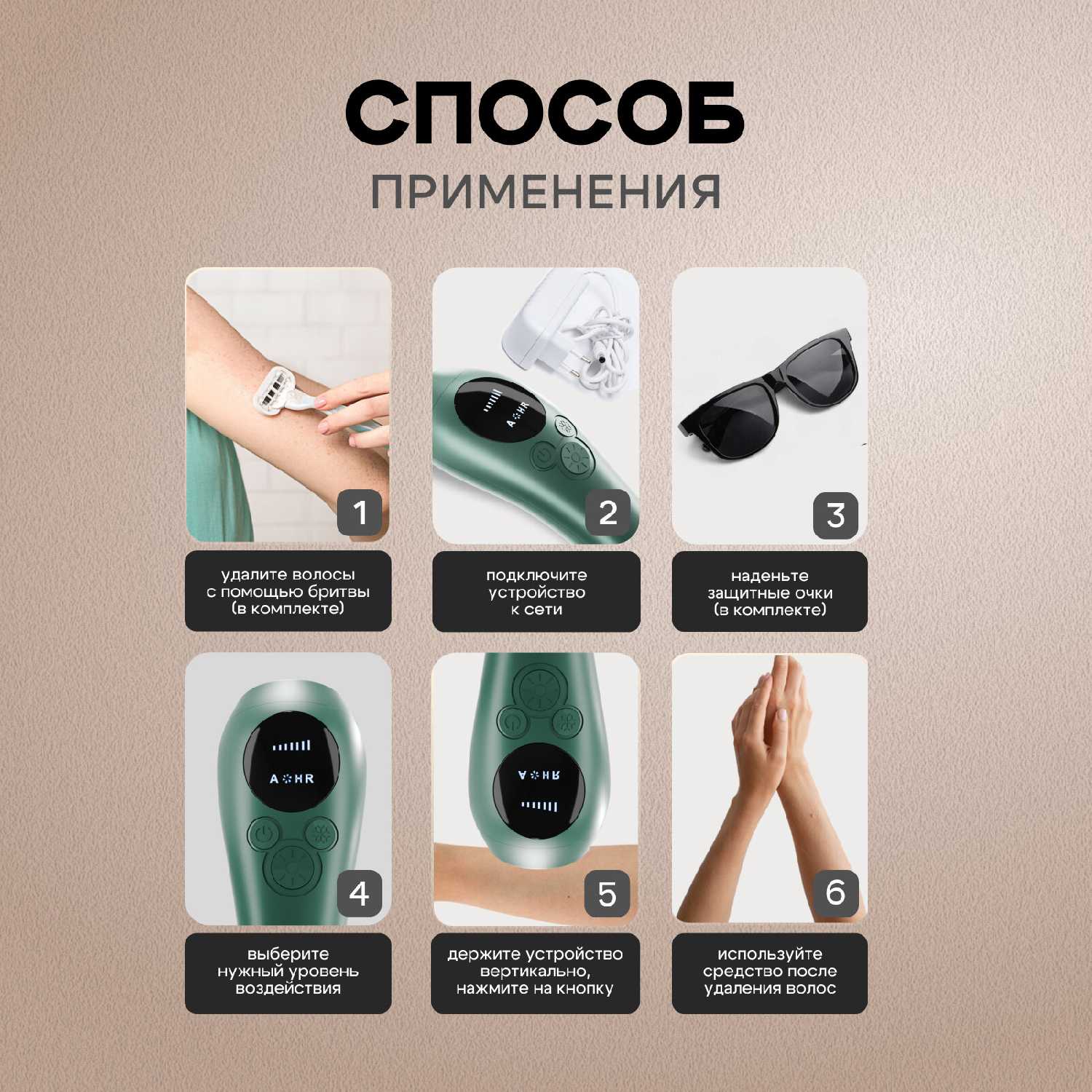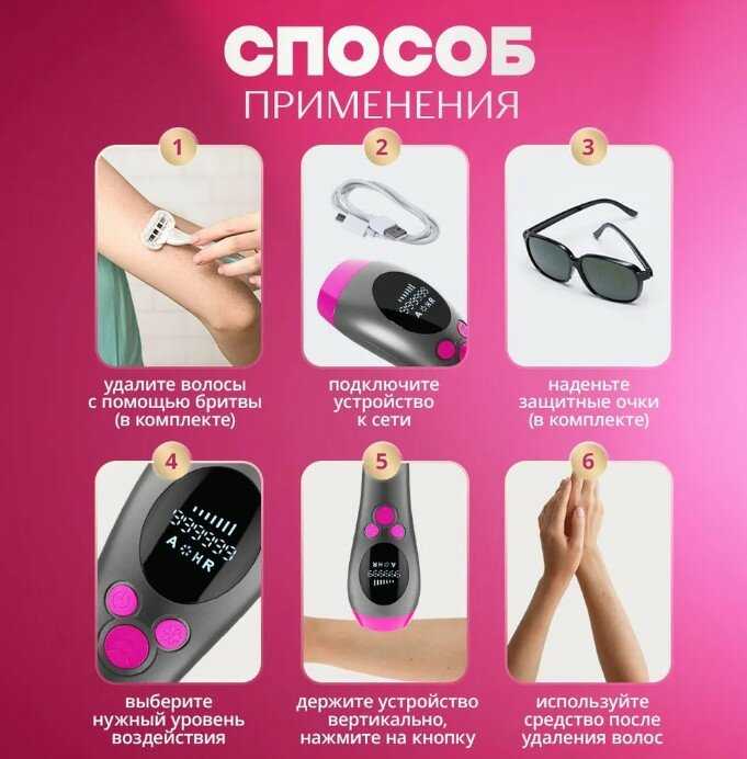 Обязательно использование защитных очков из комплекта – вспышка достаточно мощная, чтобы повредить глаза. Не допускается обработка загорелой кожи, родинок и татуировок. Перед процедурой кожу необходимо выбривать, иначе волосы могут обугливаться с неприятным запахом. -