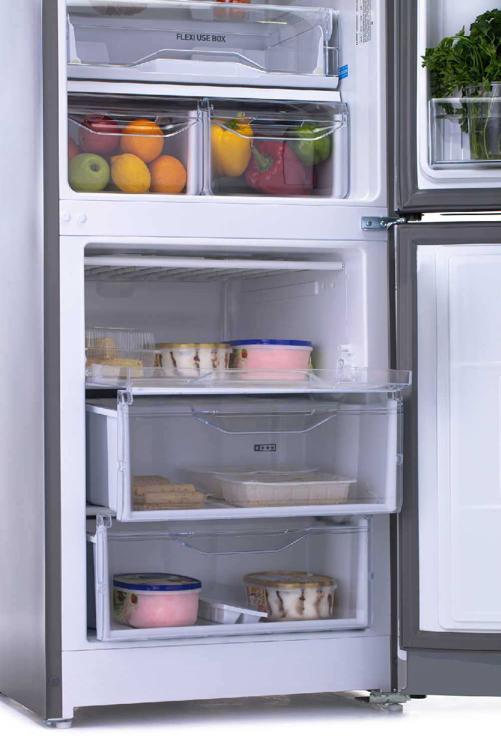- Технология поддерживает оптимальную влажность, сохраняя свежесть овощей и фруктов в специальном выдвижном контейнере.