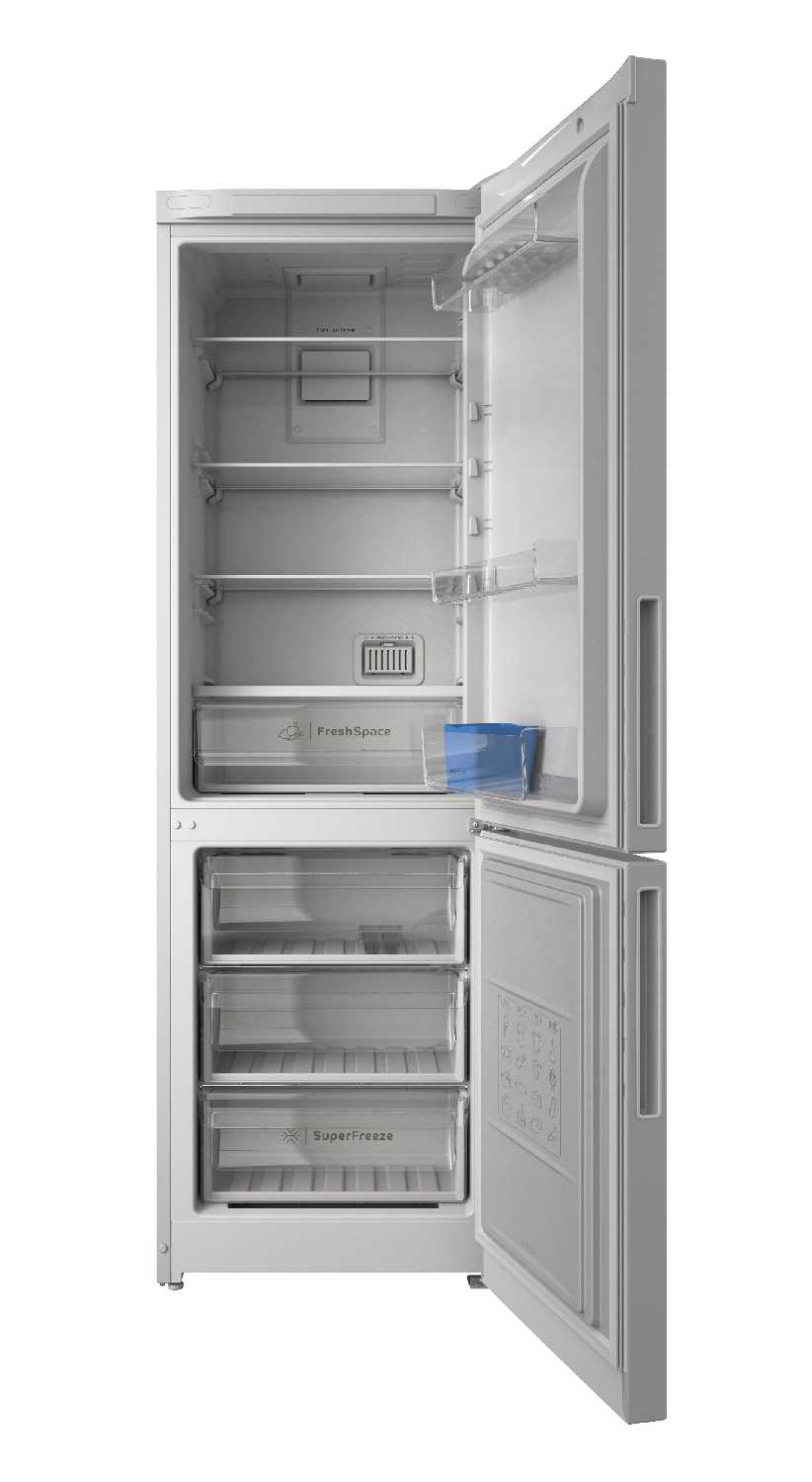 При росте пользователя 160-170 см не требуется наклоняться за часто используемыми продуктами из холодильного отсека. Заморозка распределена по 4 выдвижным контейнерам, что удобно для сортировки мяса, овощей, полуфабрикатов. При этом морозилка не "перегружает" верхнюю часть корпуса, снижая риск падения при неправильной транспортировке.