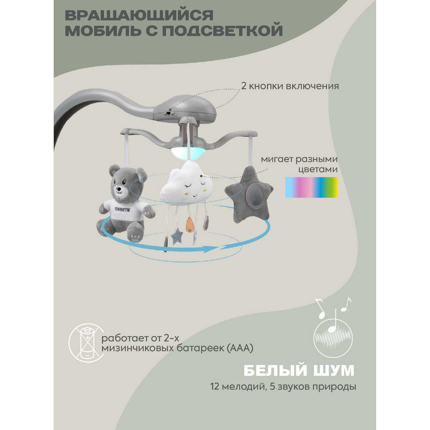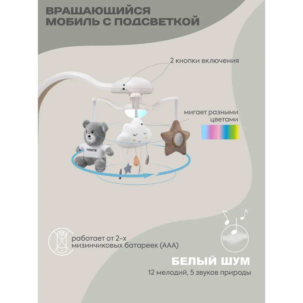 Особенности : | работа от батареек, таймер музыки, таймер укачивания |