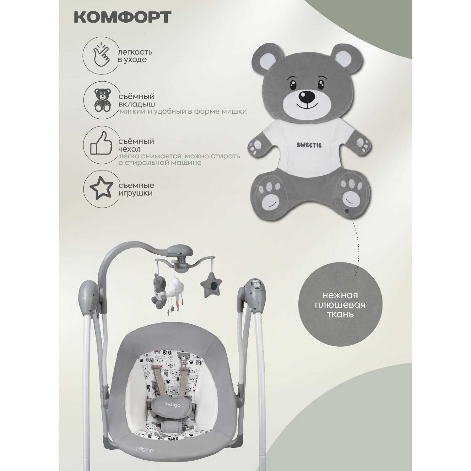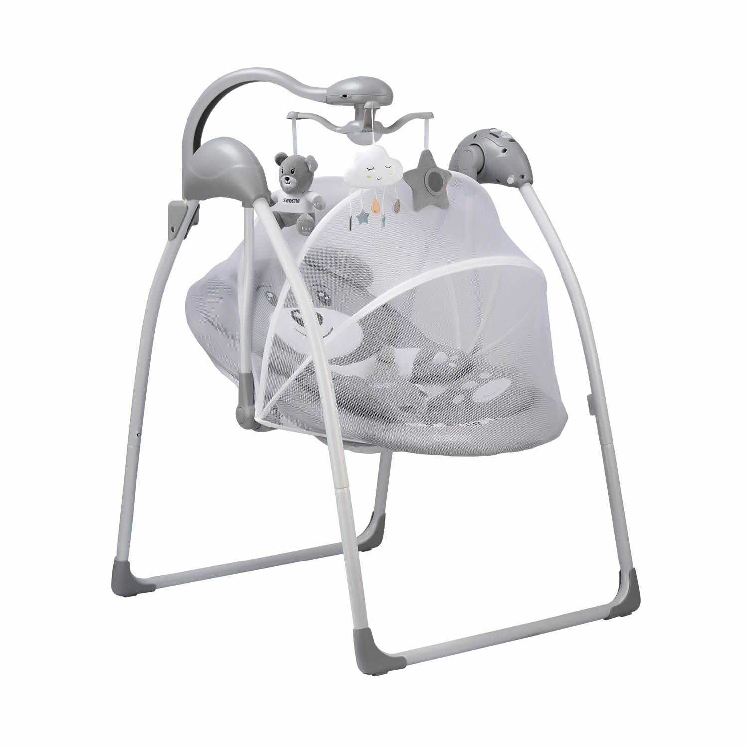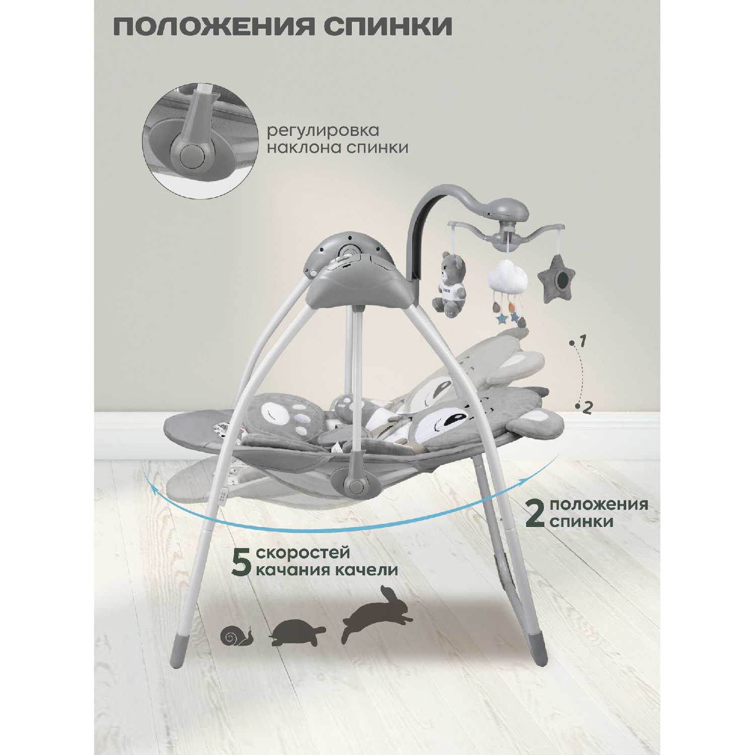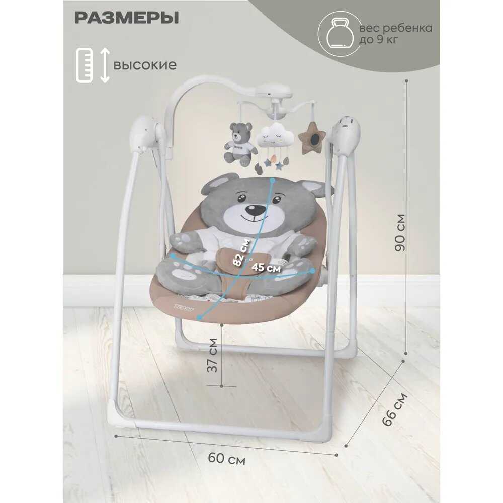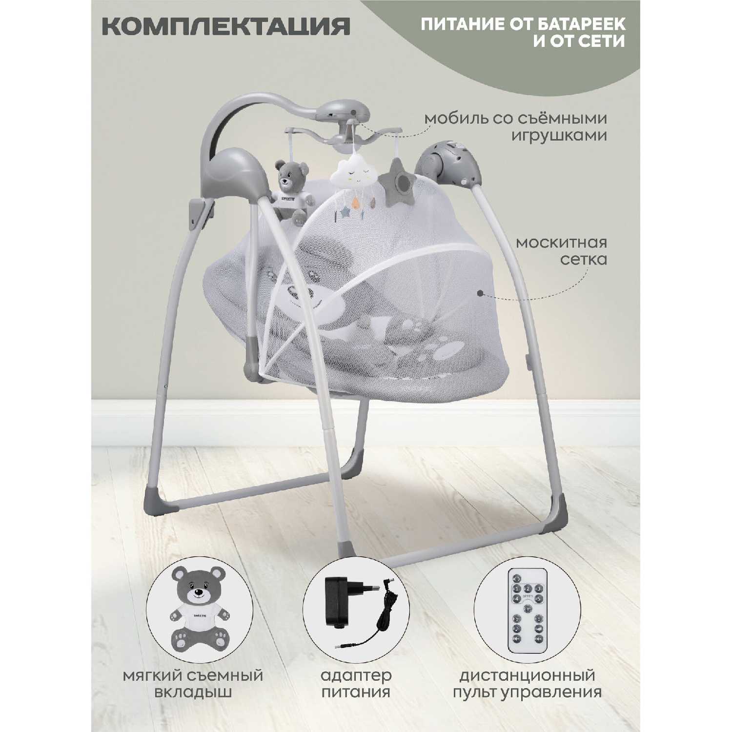 Комплектация : | Электрокачели, пульт, блок питания, мобиль с игрушками, москитная сетка |