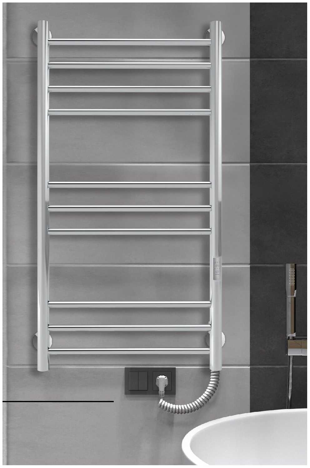 - + Классный и недорогой электрический полотенцесушитель. Он небольшой, хорошо подходит для небольшой ванной комнаты. На нем комфортно можно разместить несколько полотенец сразу, они быстро и равномерно просушатся.