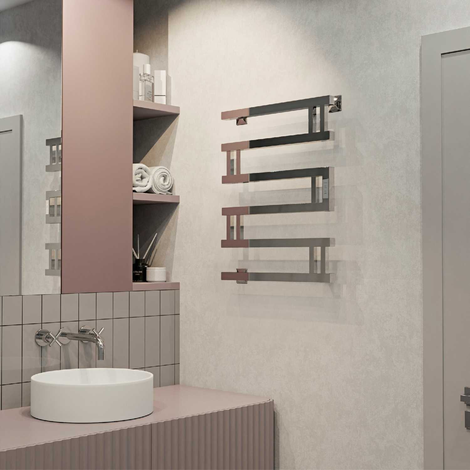 Смотрится очень стильно, окрашен хорошо, краска не стирается и не оставляет пятен на одежде. Возможность скрытого подключения. Вполне справляется с поддержанием комфортной температуры для санузла в 4 квадрата.