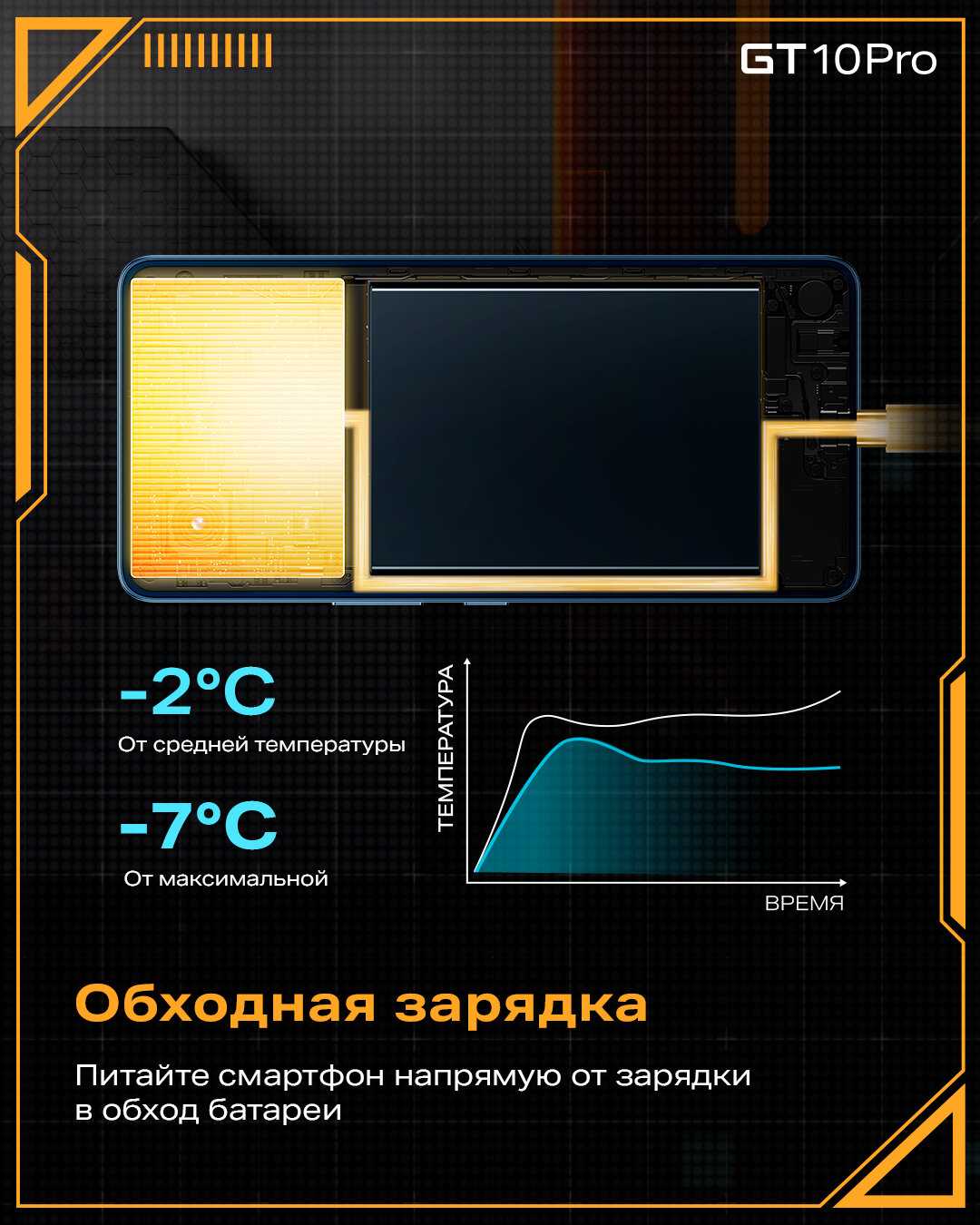 - Полный заряд 5000 мАч за 45 минут с функцией обходной зарядки для игр без перегрева батареи.