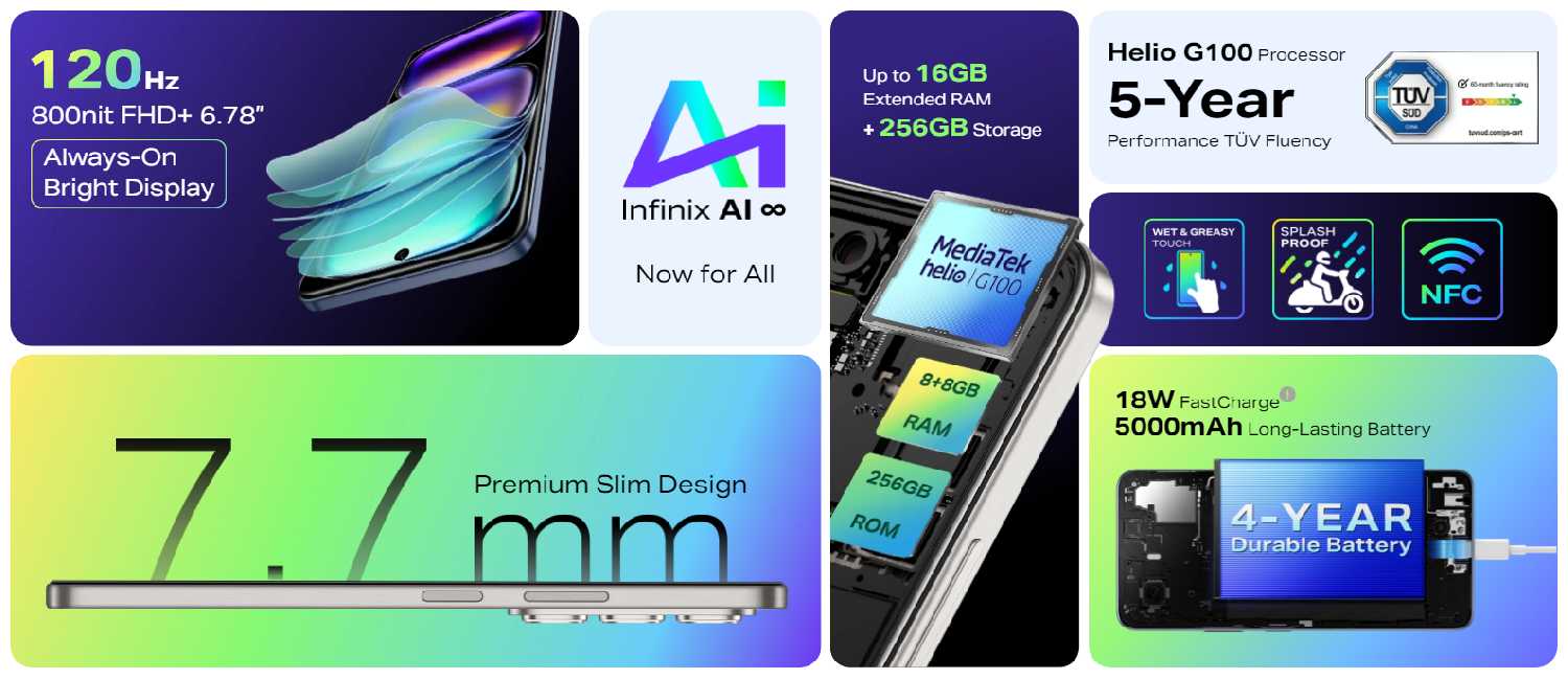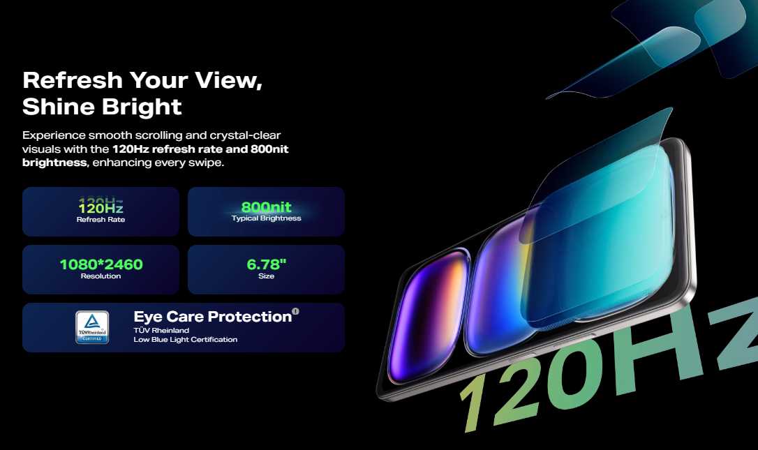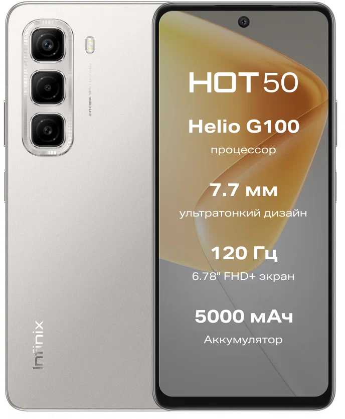 - + Смартфон Infinix HOT 50 впечатляет сочетанием производительности и эргономики. Мощный процессор MediaTek Helio G100 (8 ядер, 2.2 ГГц) и 8 ГБ оперативной памяти обеспечивают плавную работу в повседневных задачах: мессенджеры, соцсети, потоковое видео. 6.78-дюймовый FHD+ экран с частотой обновления 120 Гц и пиковой яркостью 800 нит делает навигацию и просмотр контента комфортным даже на солнце. Отдельно радует тройная камера с основной матрицей 50 МП (f/1.6) — снимки получаются детализированными даже при слабом освещении. Аккумулятор 5000 мАч с поддержкой быстрой зарядки 18 Вт легко выдерживает день активного использования. Дополнительные плюсы: NFC, сканер отпечатка пальца, слот для карты памяти microSDXC до 2 ТБ и обновление до Android 14 с оболочкой XOS 14.5.
