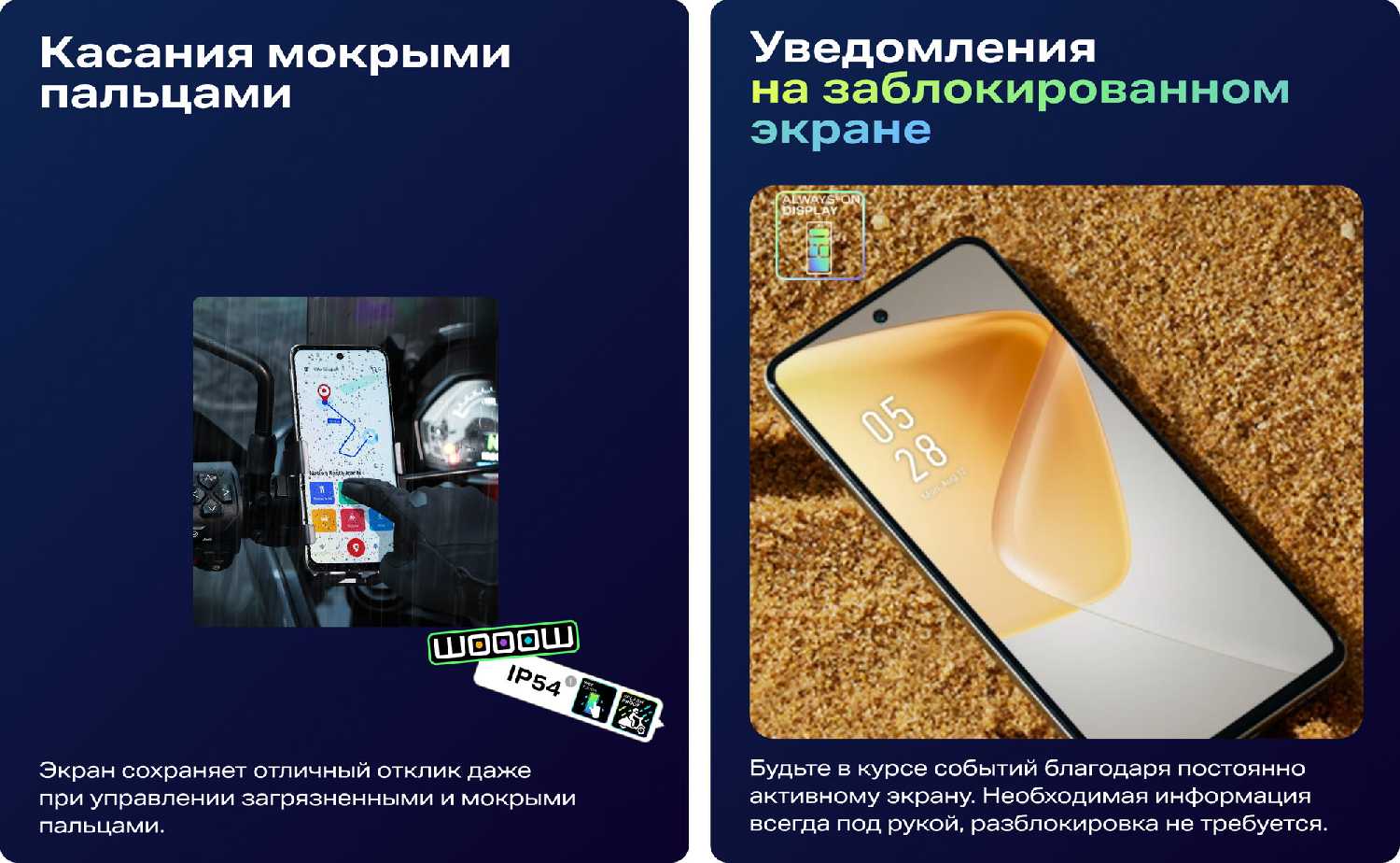 - Читаемость на солнце без бликов повышает удобство использования на улице.