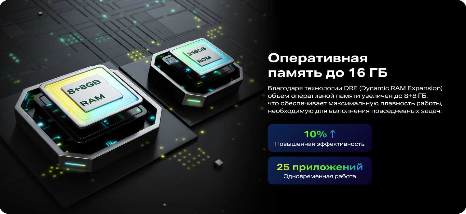 - Процессор MediaTek Helio G100 обеспечивает стабильную производительность в задачах: