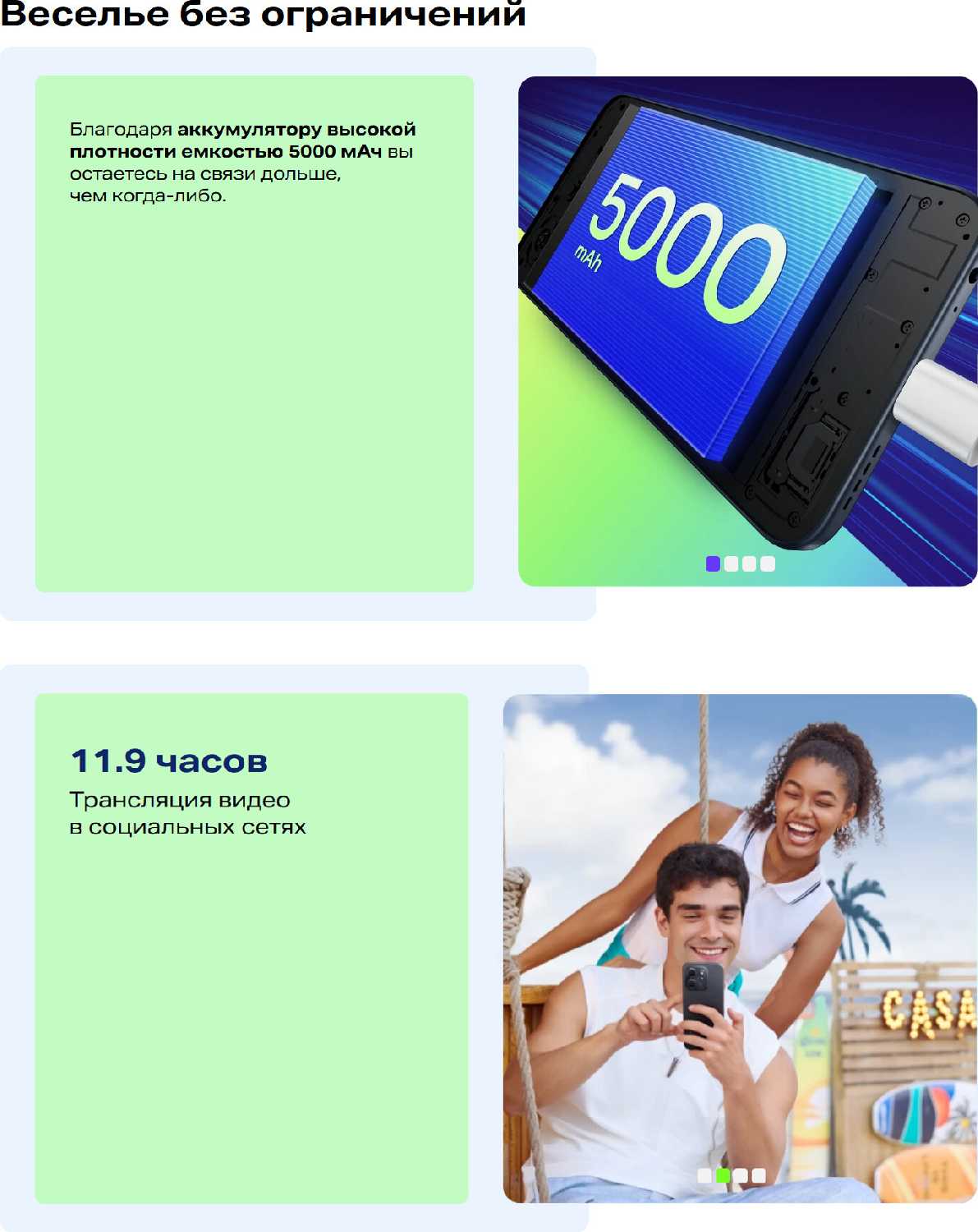 - Аккумулятор 5000 мАч обеспечивает 14-16 часов смешанного использования (соцсети, YouTube, навигация).