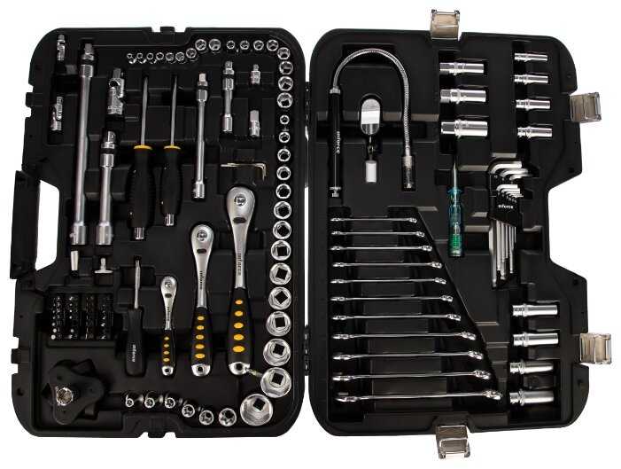 Дополнительная информация : | комплектация: 1/4" торцевые головки, 3/8" торцевые головки, 1/2" торцевые головки, 1/4" удлиненные торцевые головки, 1/2" удлиненные торцевые головки., 1/2" головки Е-типа, 3/8" свечные головки с магнитом, 1/2" свечная головка с магнитом, 1/4", 1/2" и 3/8" карданные шарниры - 3, 3/8" удлинители для головок – 100 и 175 мм - 2, 1/2" Удлинители для головок – 155 и 280 мм - 2, 1/4"M – 3/8"F адаптер, 1/2"М – 3/8"F адаптер, 1/4" адаптер для бит - 3, набор бит в пластиковом держателе, 1/4"F×1/4"M диск, 1/4" отвертка-держатель – 150 мм, 1/4" трещоточный ключ – 72 зубца, 3/8" трещоточный ключ – 72 зубца, 1/2" трещоточный ключ – 72 зубца, набор шестигранных ключей, набор имбусовых шестигранных ключей с держателем, комбинированные ключи, ударные отвертки, телескопическая рукоятка с зеркалом, отвертка-тестер, универсальный съемник масляных фильтров, кейс |