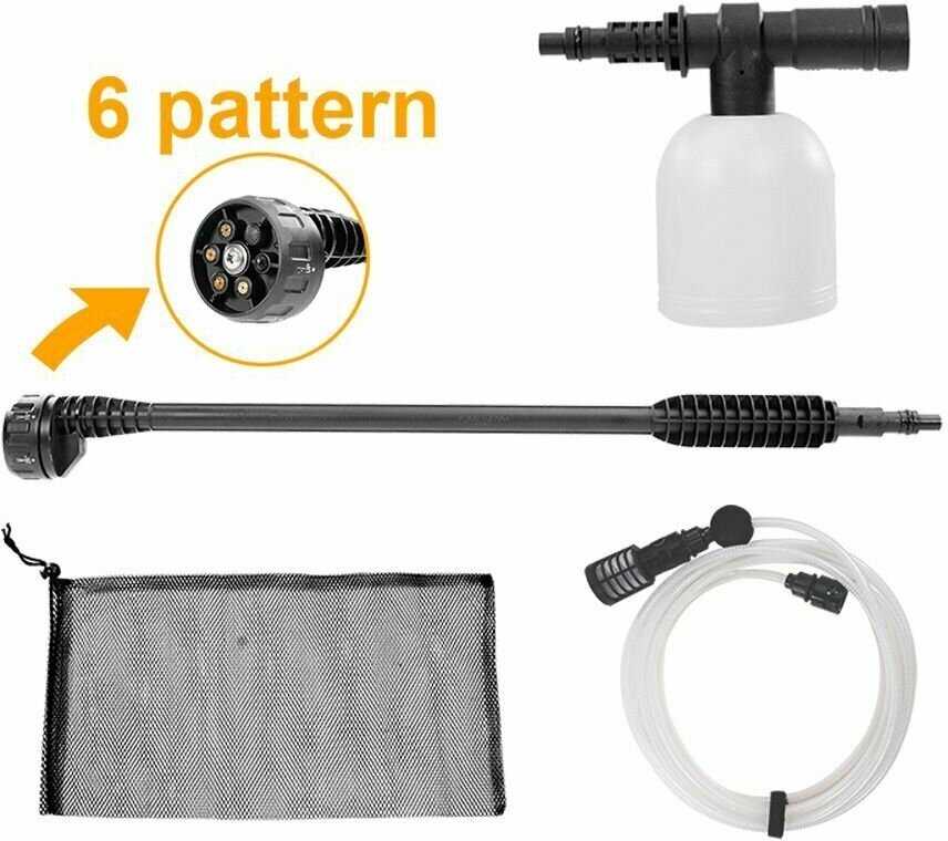Подробная комплектация : | Мойка - 1 шт., многофункциональная форсунка 6 в1 - 1 шт., игла для чистки форсунок - 1 шт., бачек для моющего средства 40 мл - 1 шт. всасывающий шланг 6 м - 1 шт., грязевой фильтр для всасывающего шланга - 1 шт., дополнительный соединитель для шланга - 1 шт., сетчатый мешок для соединителей и шланга - 1 шт., инструкция |