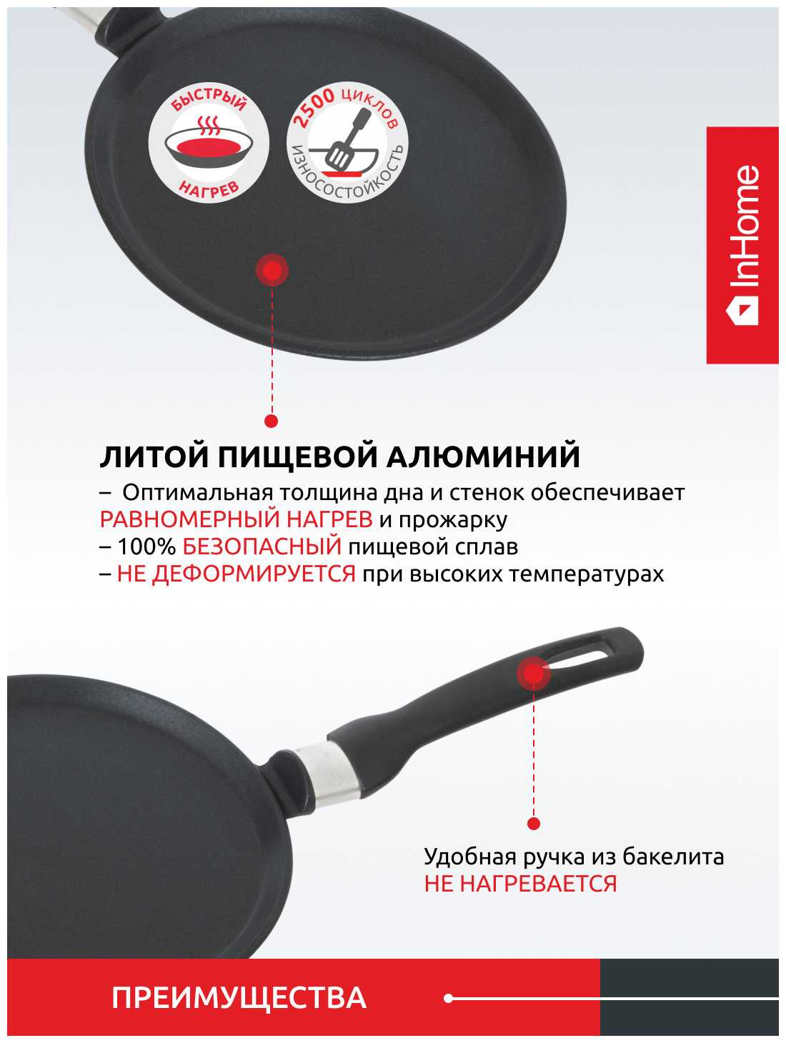 - Равномерное распределение тепла благодаря толстому литому дну, что обеспечивает румяную корочку без подгорания.