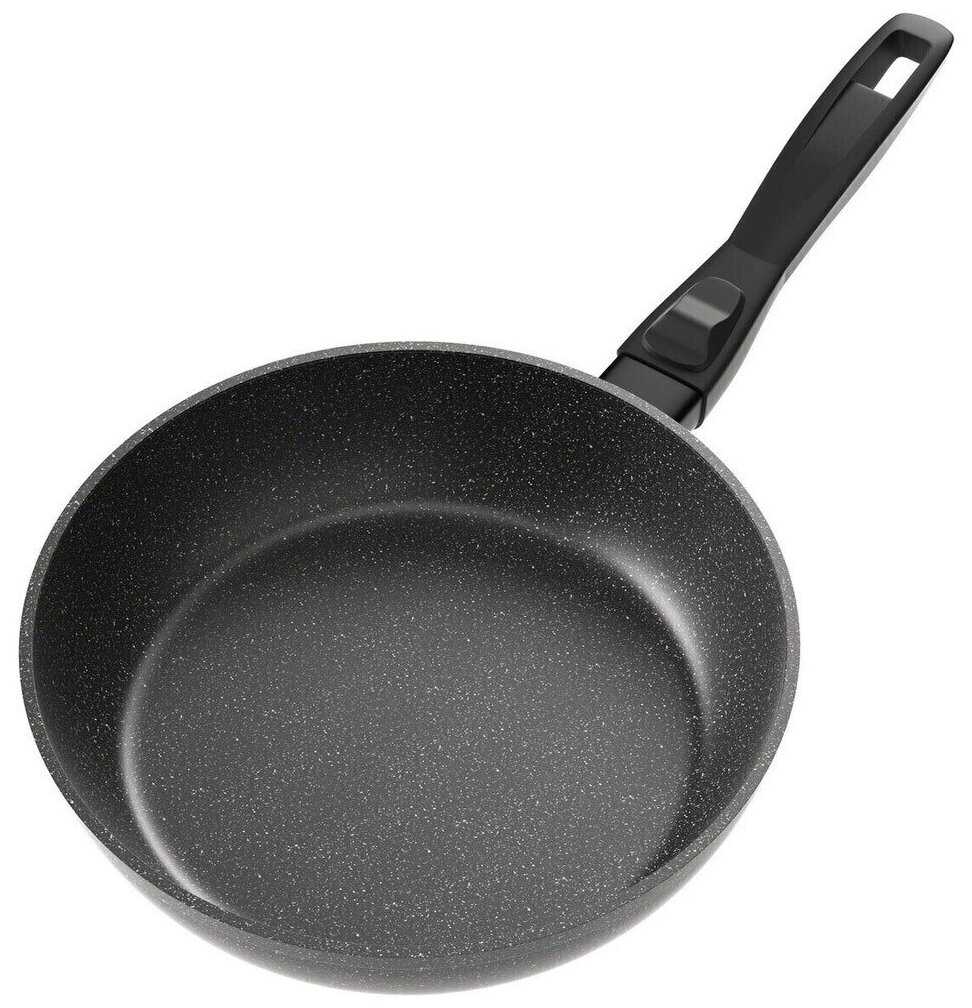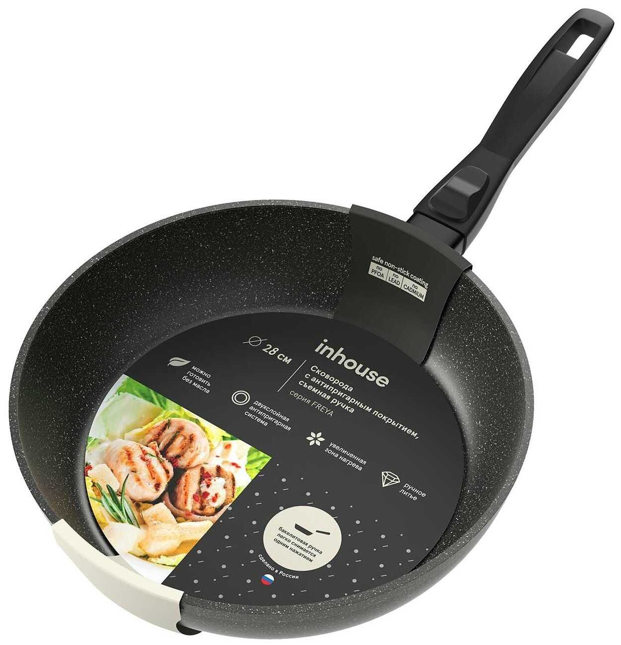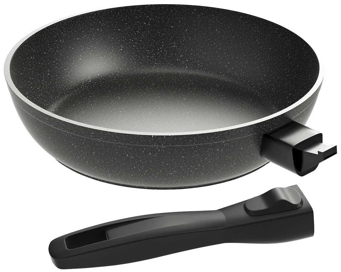 - + Съемная ручка - удобно, покрытие хорошее, прочное, достаточно тяжелая, стенки прочные и толстые, для использования нужно совсем немного масла.