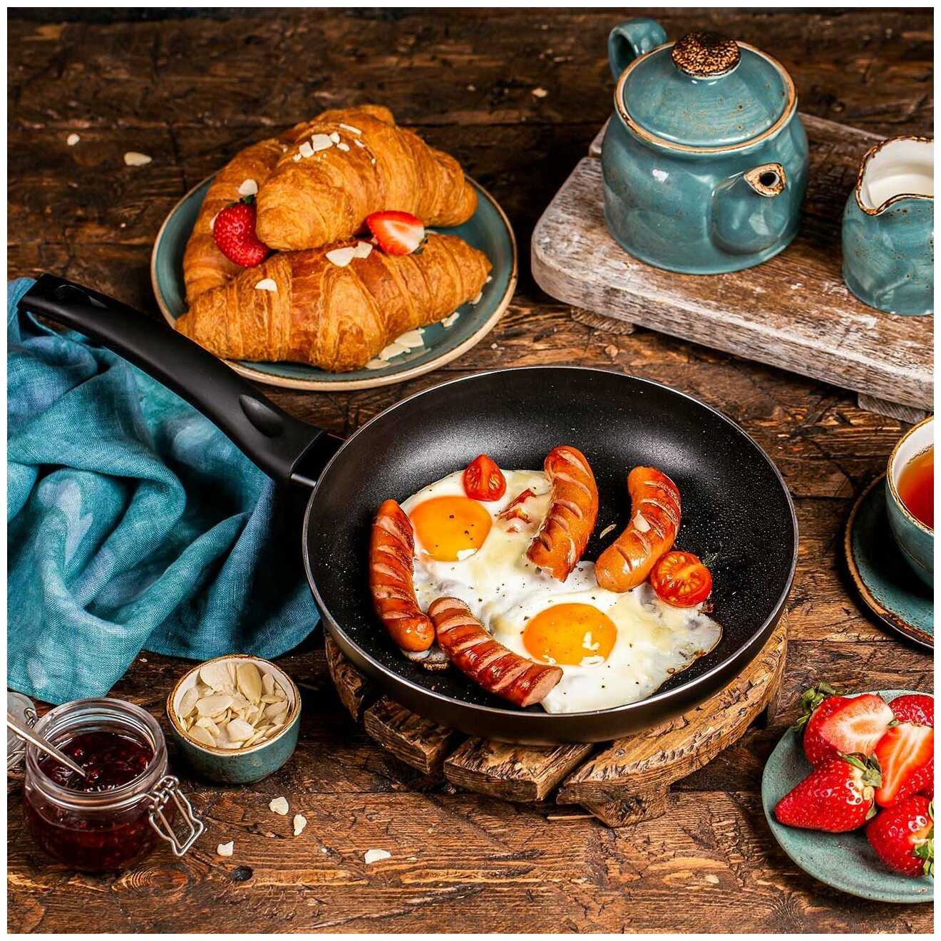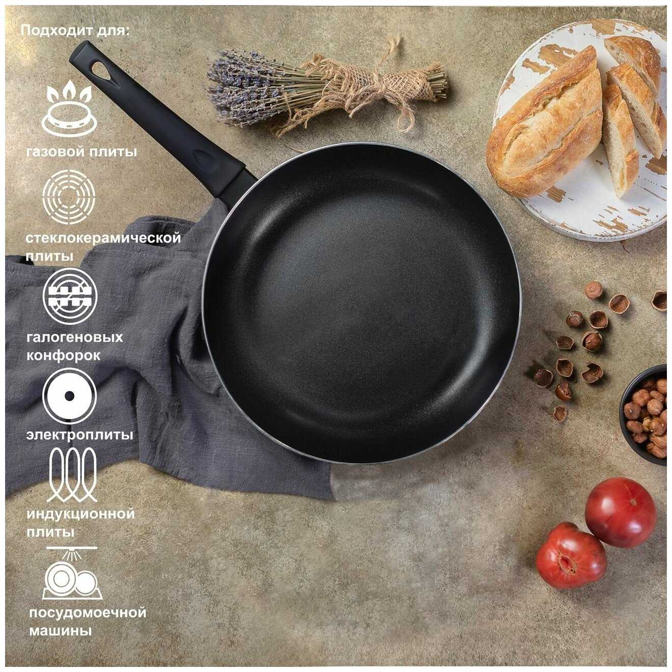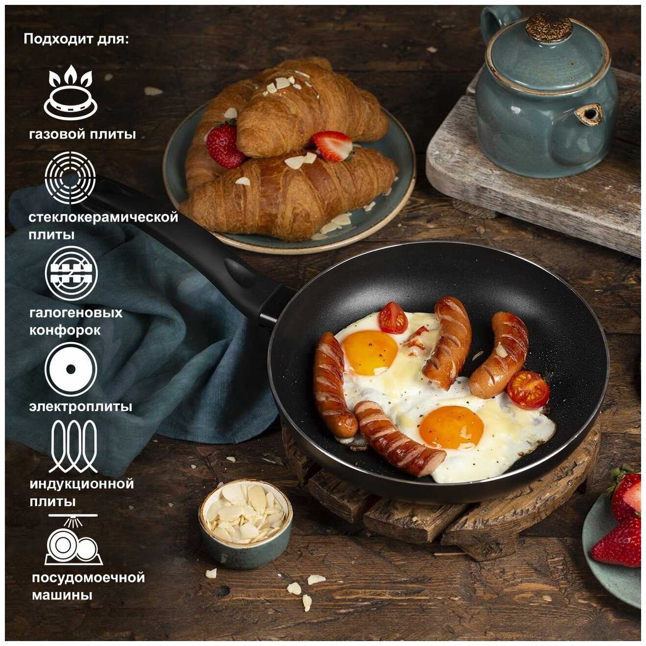 Идеальна для объемных блюд: тушения овощей (глубина 6 см), жарки 3-4 котлет одновременно, приготовления пасты и пережарки для супа. Высокие борта предотвращают разбрызгивание. Для блинов и омлетов подходит при условии контроля деформации дна.