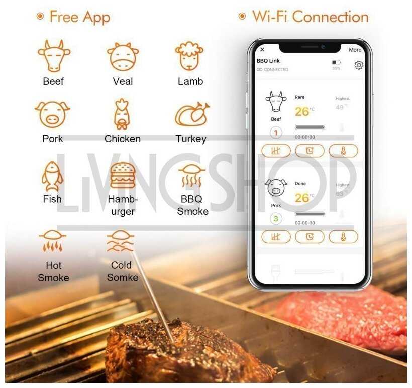 - Приложение информативное, с оповещениями о достижении заданных значений и преднастройками для разных типов мяса.