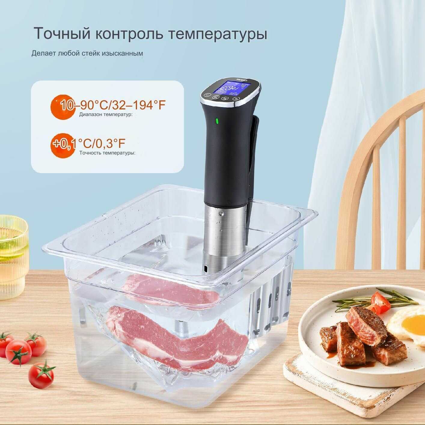 Точность температурного контроля и стабильность работы: Прибор демонстрирует высокую точность поддержания заданной температуры воды, что является основополагающим параметром для технологии sous-vide. Пользователи единогласно подтверждают, что устройство стабильно держит установленную температуру, и это напрямую влияет на превосходный результат: мясо (стейки, грудки, ребра, рулька), рыба и овощи получаются сочными, нежными и равномерно приготовленными. Важной технической особенностью, отмеченной в отзывах, является алгоритм работы таймера: отсчет времени приготовления начинается только после того, как вода в емкости достигла заданной температуры, а не с момента включения прибора. Это гарантирует точное соблюдение рецептуры. Критичный недостаток, выявленный одним пользователем, – некорректные показания датчика температуры на дисплее после поломки помпы, когда значения «прыгали» выше установленных, что свидетельствует о взаимосвязи работы сенсоров и циркуляционного насоса.
