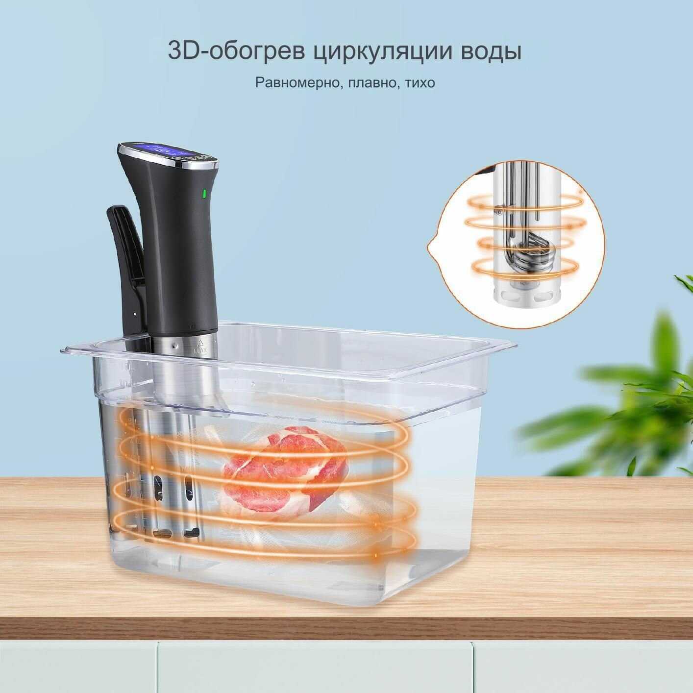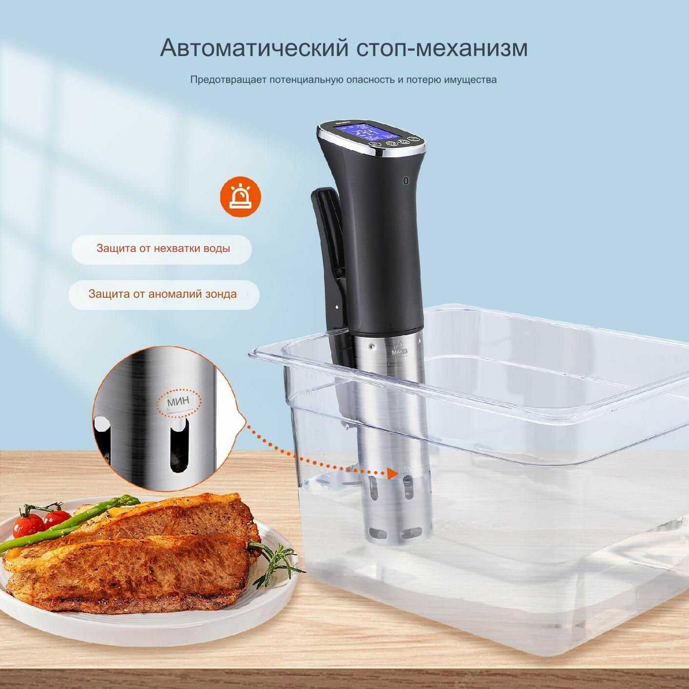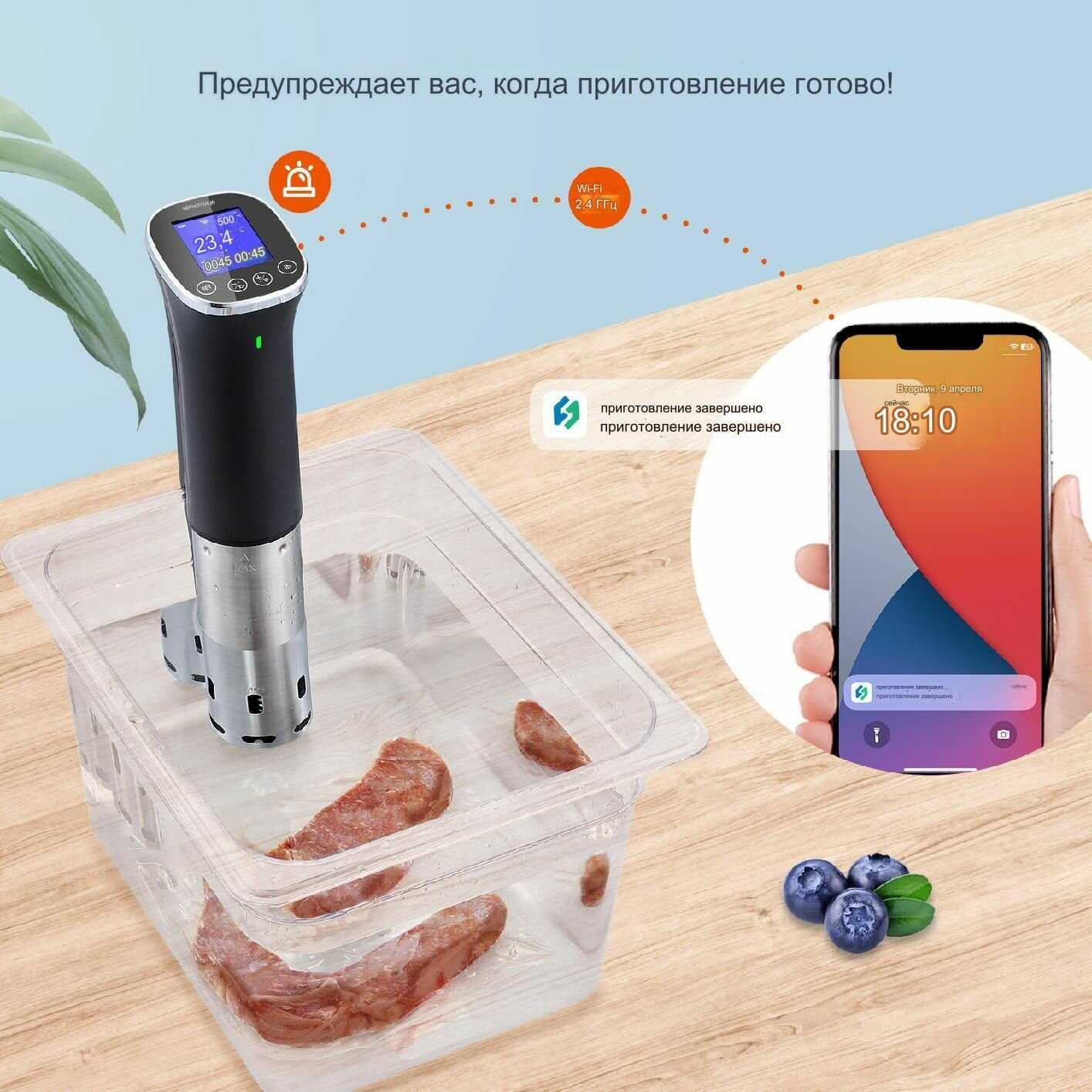 Скорость нагрева зависит от объема воды и исходной ее температуры. Пользователи отмечают, что прибор успешно справляется с нагревом стандартных объемов (например, 11 литров), но сам процесс выхода на заданную температуру занимает некоторое время. Стоит учитывать, что су-вид — это не скоростной способ готовки; его преимущество в точном и длительном низкотемпературном воздействии, а не в быстроте нагрева. -