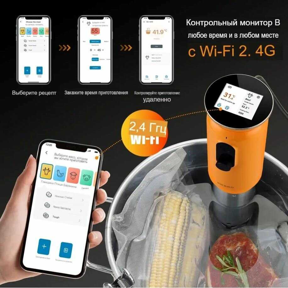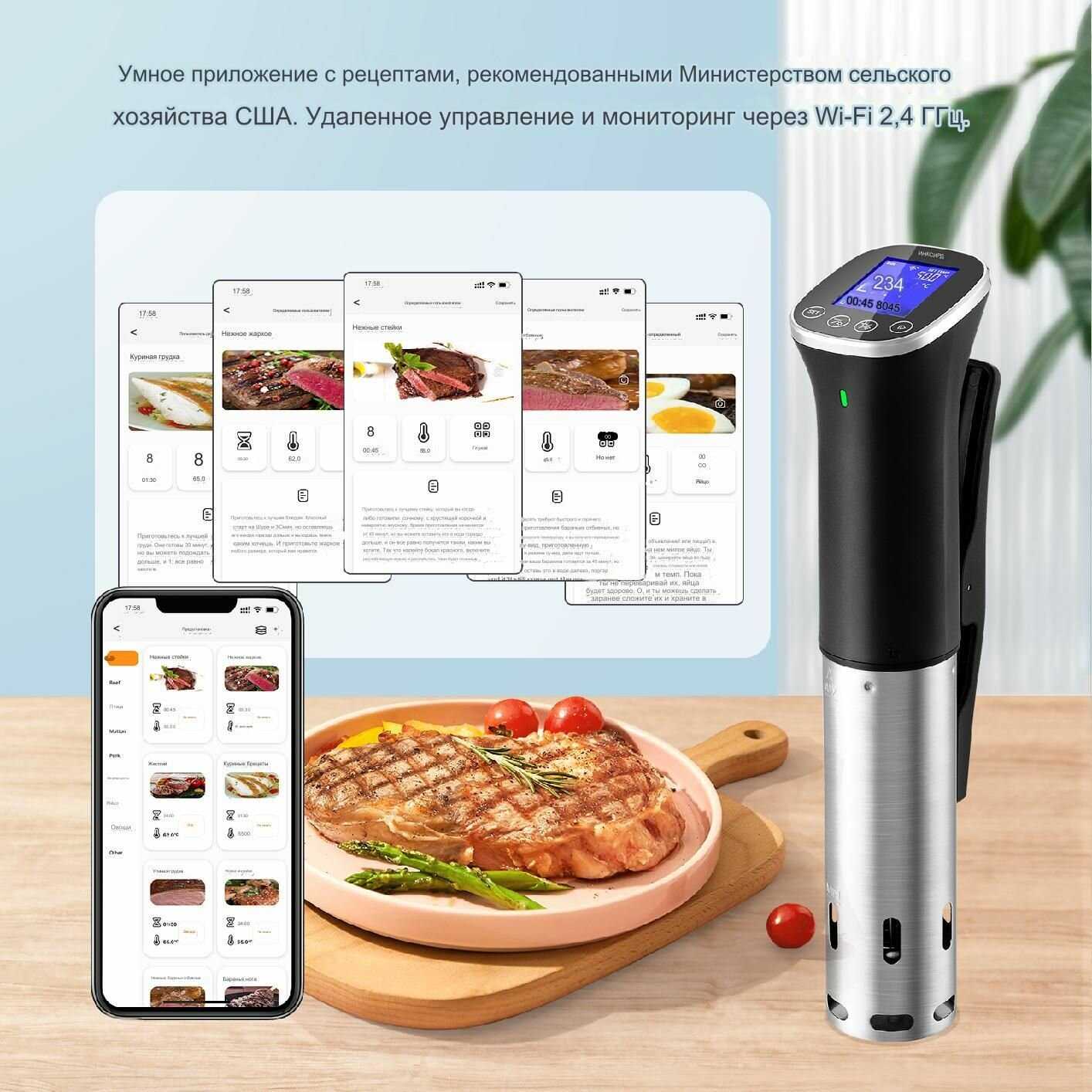 Идеальный пользователь и области применения: Данная модель оптимально подходит для домашних кулинаров-энтузиастов, которые ценят точность, стабильность результата и возможность удаленного контроля. Устройство открывает новые возможности для приготовления здоровой пищи, идеально для белковых продуктов (мяса всех видов, птицы, рыбы), обеспечивая неизменно сочный и нежный результат, который сложно достичь классическими методами. Оно также позволяет готовить сложные блюда, такие как домашняя ветчина, колбаса, конфи или йогурт. Аппарат будет особенно оценен теми, кто разочарован неинтуитивным управлением аналогов других брендов (прямо упоминается конкурент «Китфорт»). Важно понимать, что процесс приготовления sous-vide является длительным (от 1,5 часов для грудки до 18 часов для окорока), и прибор выполняет функцию точного термостата, а не скоростного нагревателя.