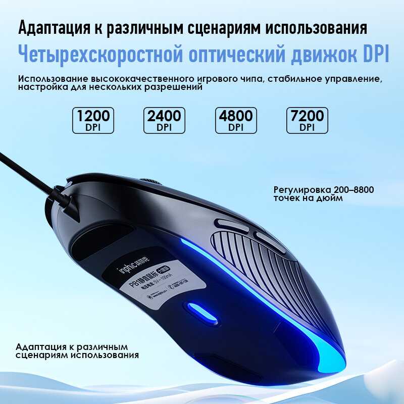 - 4 предустановленных режима DPI (800/1600/3200/7200) позволяют адаптировать чувствительность для офисных задач или графических работ.